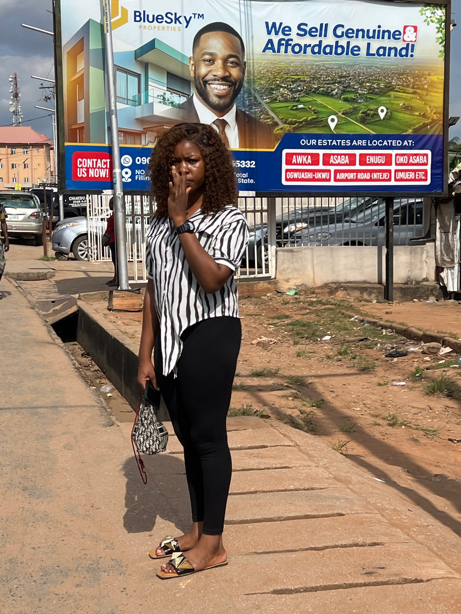 The image captures a bright outdoor scene in Onitsha, Nigeria, featuring a woman standing next to a large billboard on a sunny street. The woman, positioned on the right, has curly brown hair and is w…read more