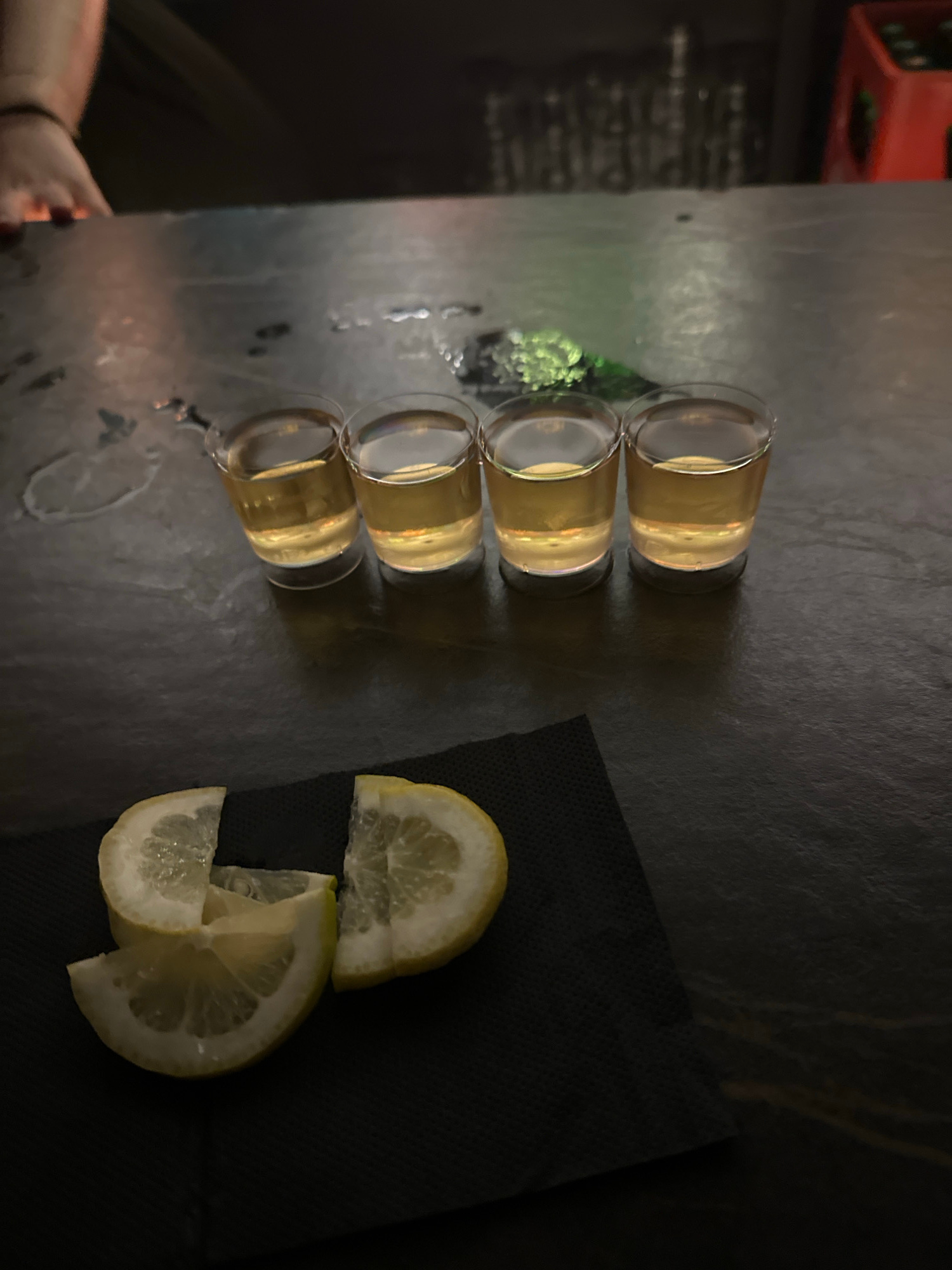 The image shows a dimly lit bar or restaurant table, likely in Alicante/Alacant, Spain, given the association of tapas with the city. Four shot glasses filled with a light amber liquid, presumably teq…read more