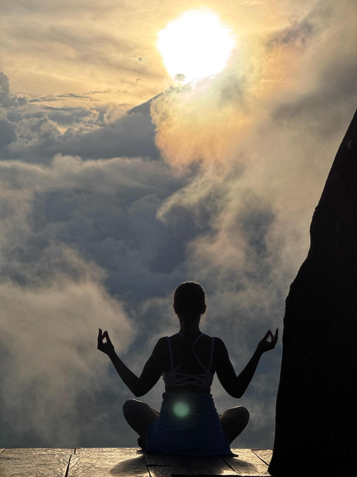 The image depicts a silhouette of a person in a meditative pose on a wooden structure against a cloudy sky with the sun visible. The person is likely female, wearing a top with a criss-cross back desi…read more