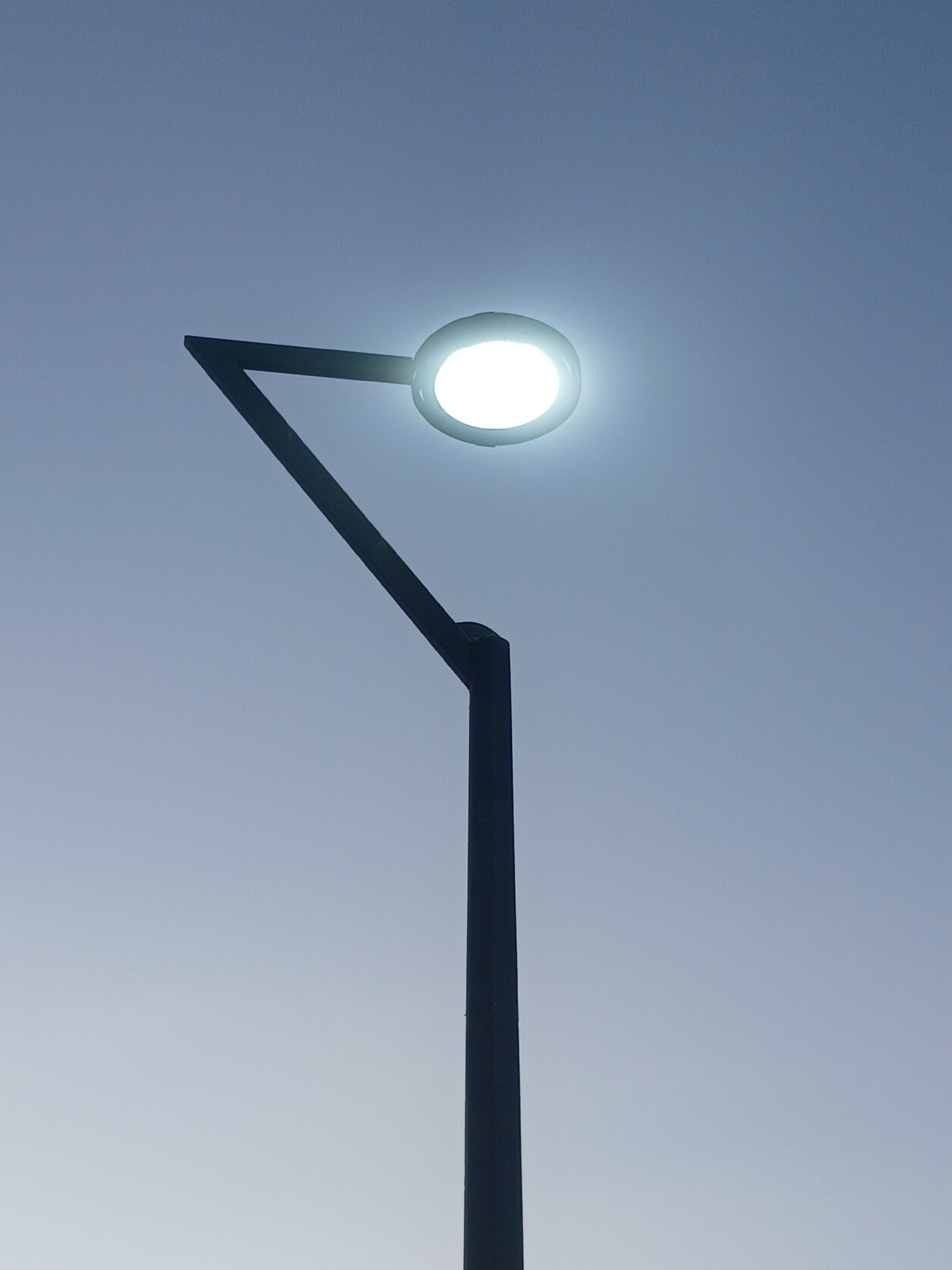 A low-angle shot captures a street light against a blue sky that fades to a lighter shade. The light itself is enclosed in a circular housing with a white, glowing bulb inside. The light is supported…read more