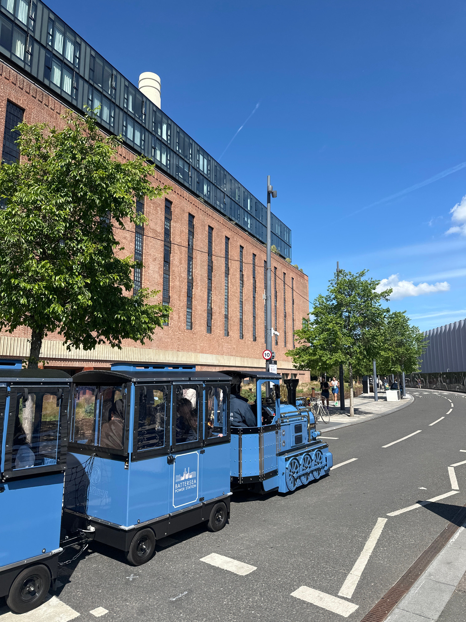 The image depicts a bright, sunny day in London, United Kingdom. A blue, train-like vehicle branded with "BATTERSEA POWER STATION" is parked on a paved street near a building that features a mix of br…read more