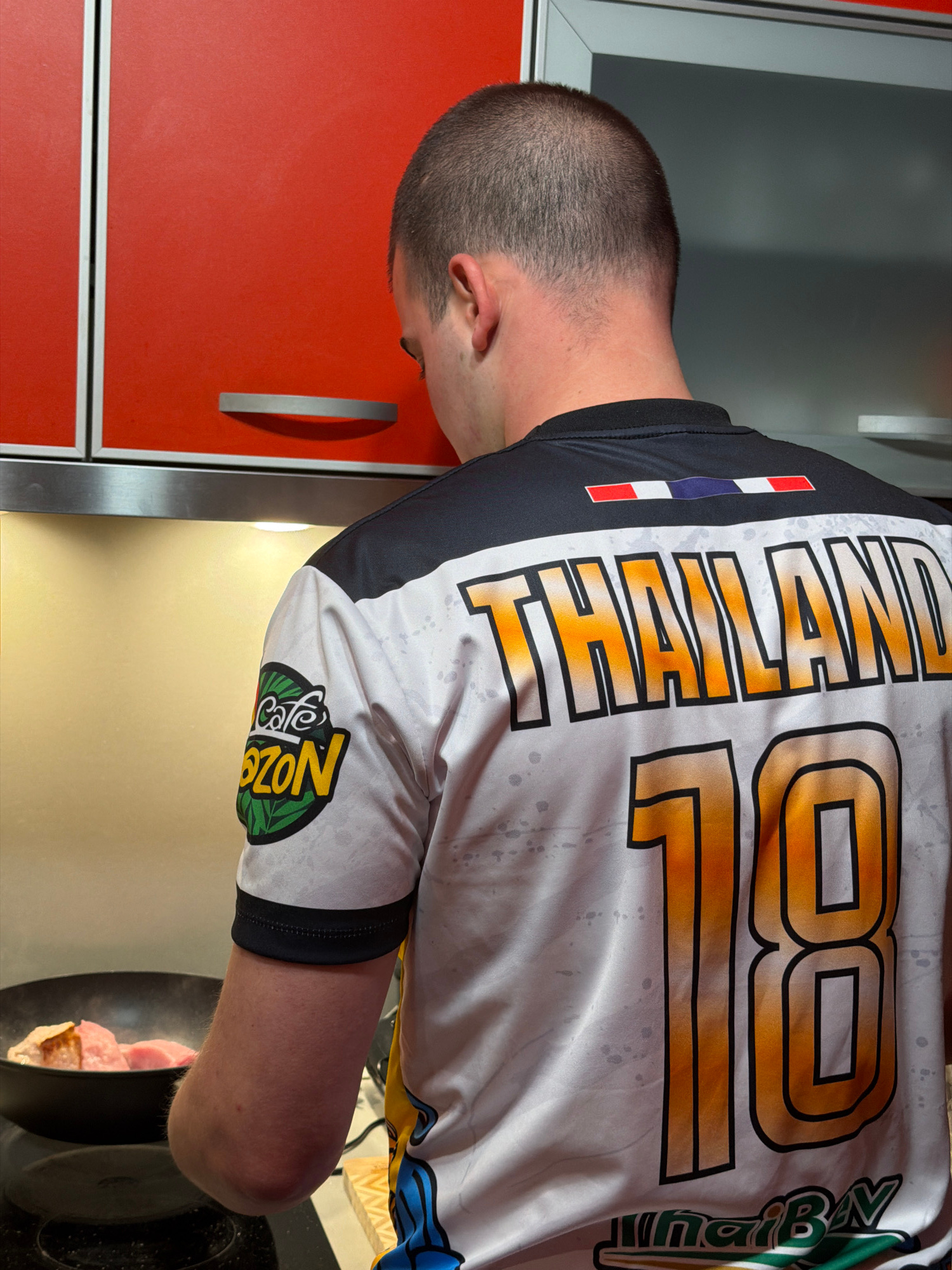 The image, taken in Varna, Bulgaria, shows a person from behind, bending over a cooking pan in what appears to be a modern kitchen. The person, likely male, has short, buzz-cut hair. The setting feat…read more