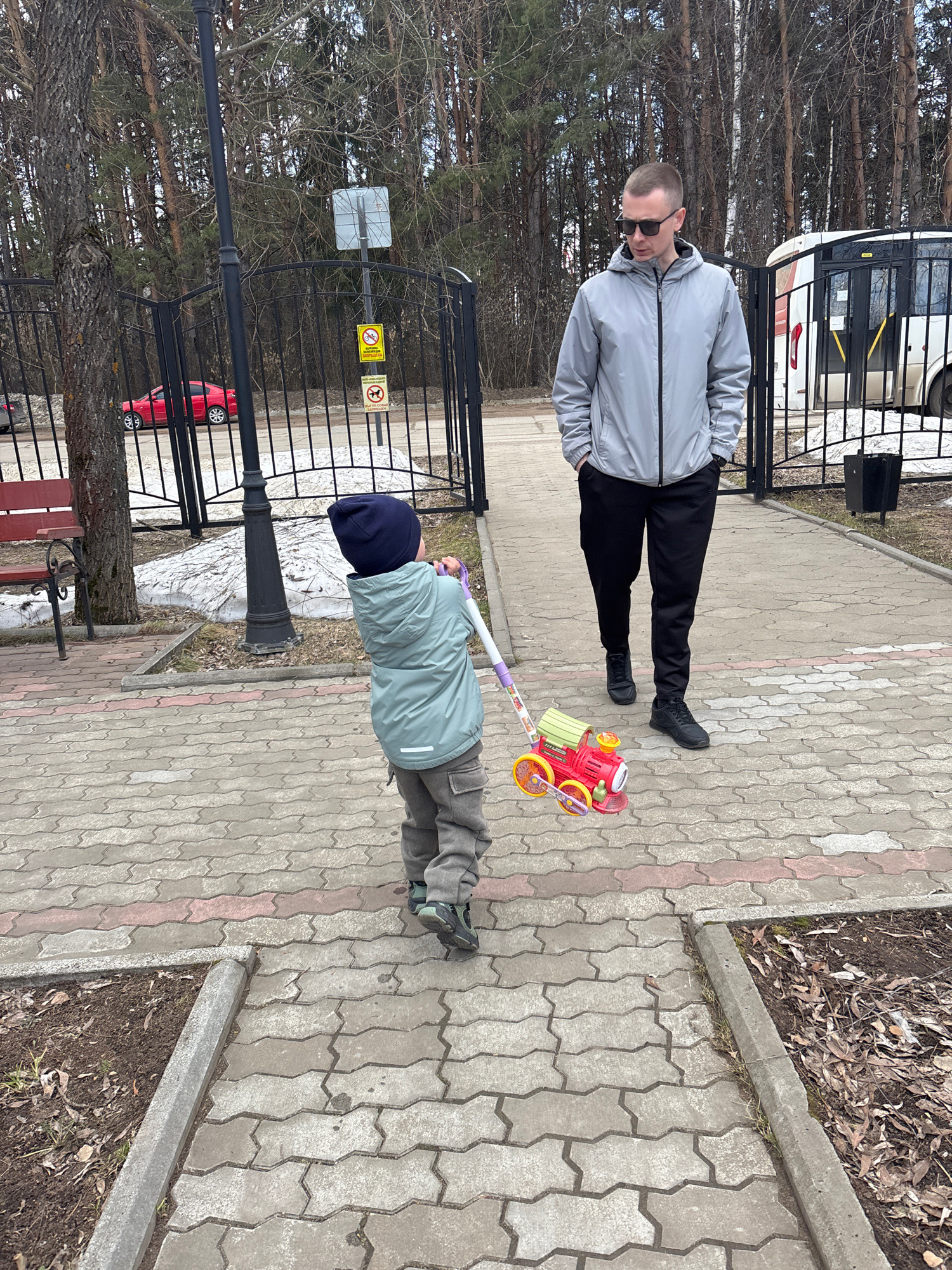 This image, taken in Chaikovsky, Russia, depicts an outdoor scene featuring an adult male and a young child on a paved walkway. The photo is rotated 90 degrees counter-clockwise from its original orie…read more