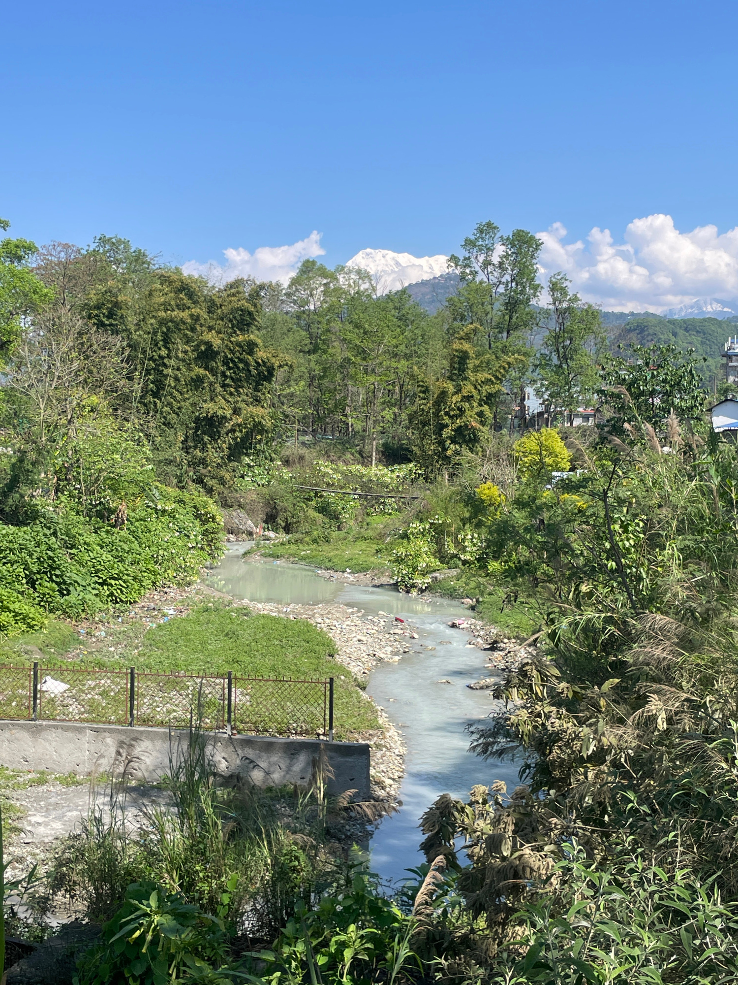 The image presents a river landscape near Pokhara, Nepal, likely a tributary of the Seti Gandaki. The water is milky and opaque, suggesting glacial runoff or high sediment load. The riverbanks are veg…read more