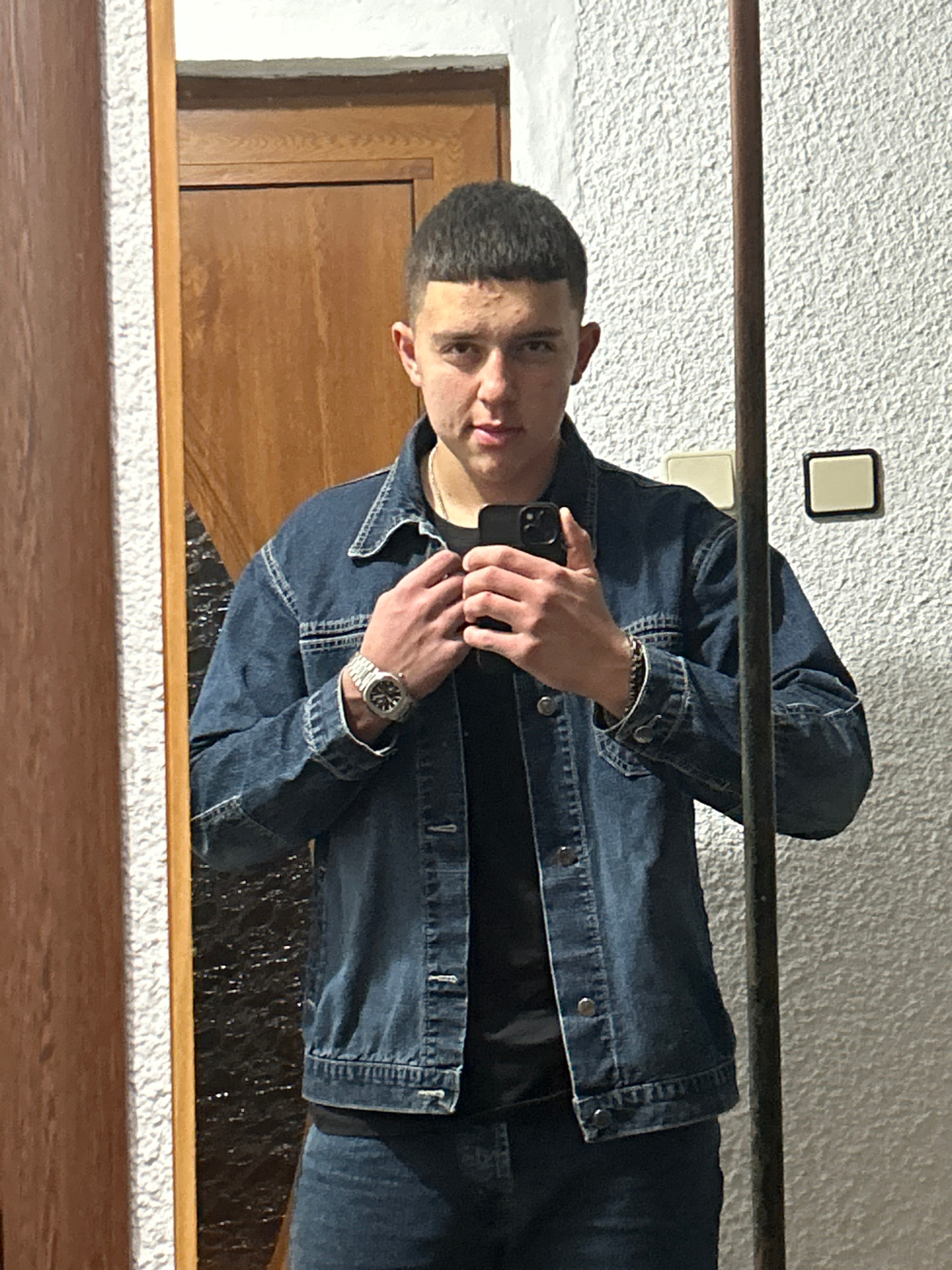 A young man stands in front of a mirror taking a selfie with his smartphone. He wears a denim jacket over a black shirt, denim pants, and a wristwatch. The reflection reveals a textured white wall, a…read more