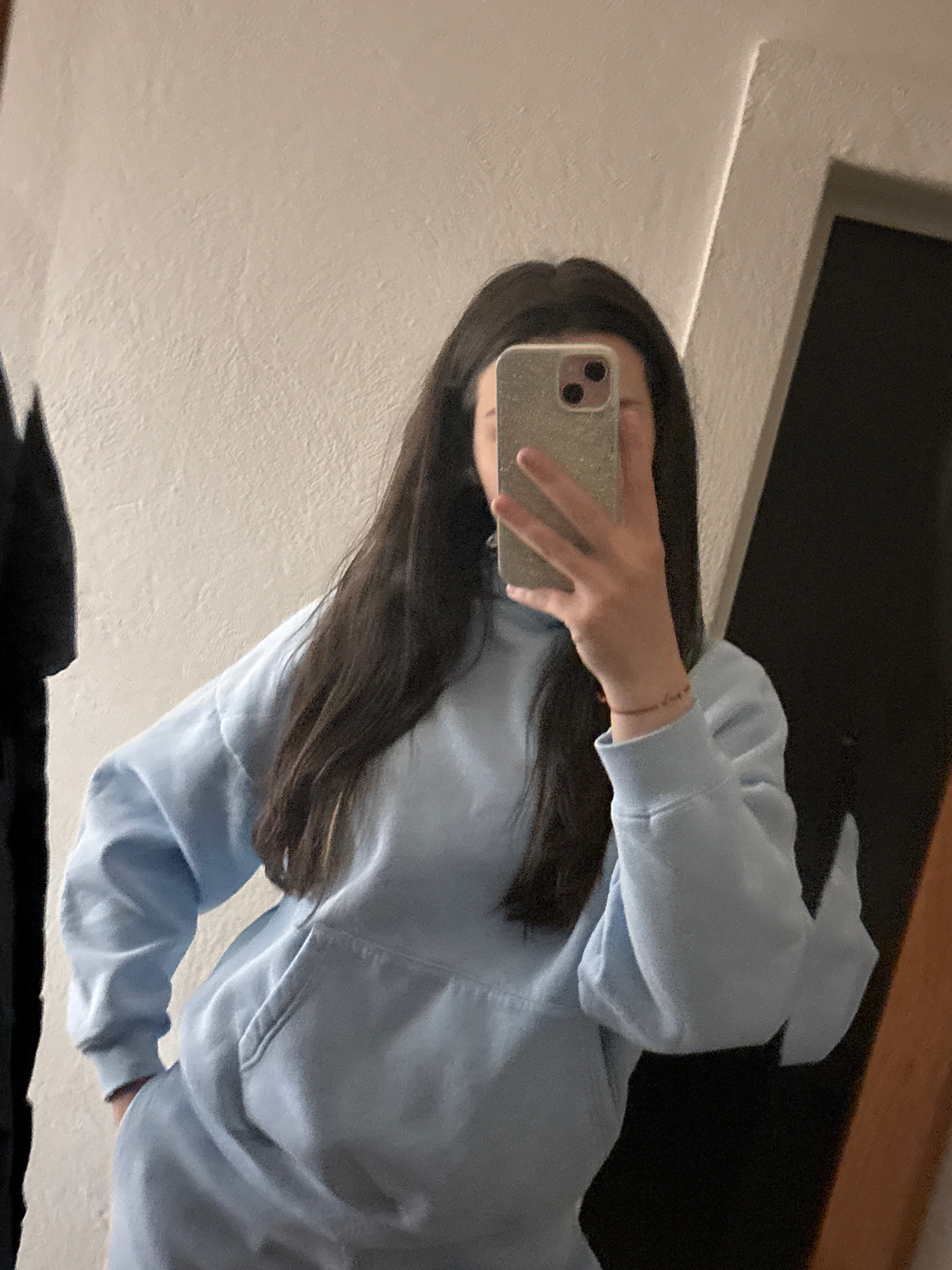 A person is taking a selfie in front of a mirror. The person has long, dark hair and is wearing a light blue hoodie. They are holding a phone in their hand, obscuring their face. The background includ…read more