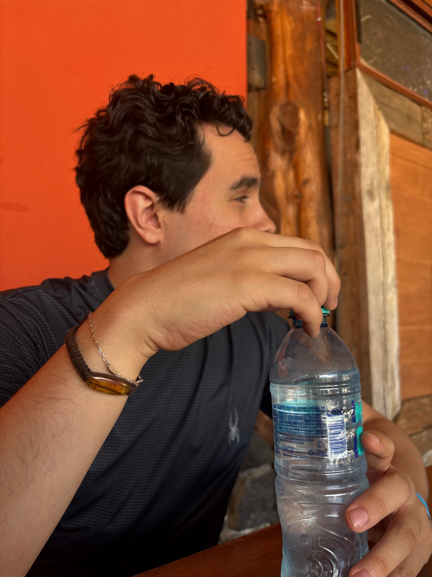 A light-skinned man is drinking from a clear plastic water bottle. He has dark curly hair, with a wrist adorned with a woven bracelet with a tan stone. He is wearing a dark blue shirt. The background…read more