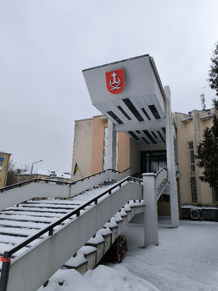 The image depicts the exterior of a building in Vinnytsia, Ukraine, under a cloudy winter sky. The building, identified by the Coat of Arms of Vinnytsia (a red shield with a silver anchor and two cros…read more