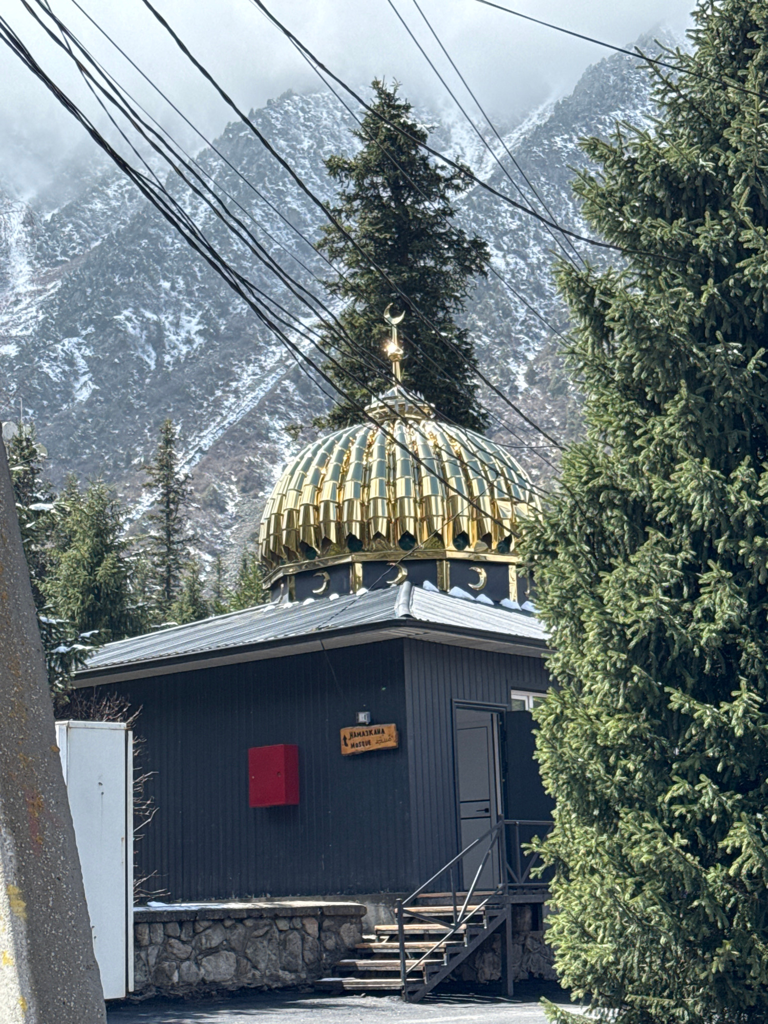 Here is a detailed description of the image: The image appears to be taken in a mountainous region, likely in Unknown, Kyrgyzstan, given the presence of a building with a golden dome reminiscent of m…read more