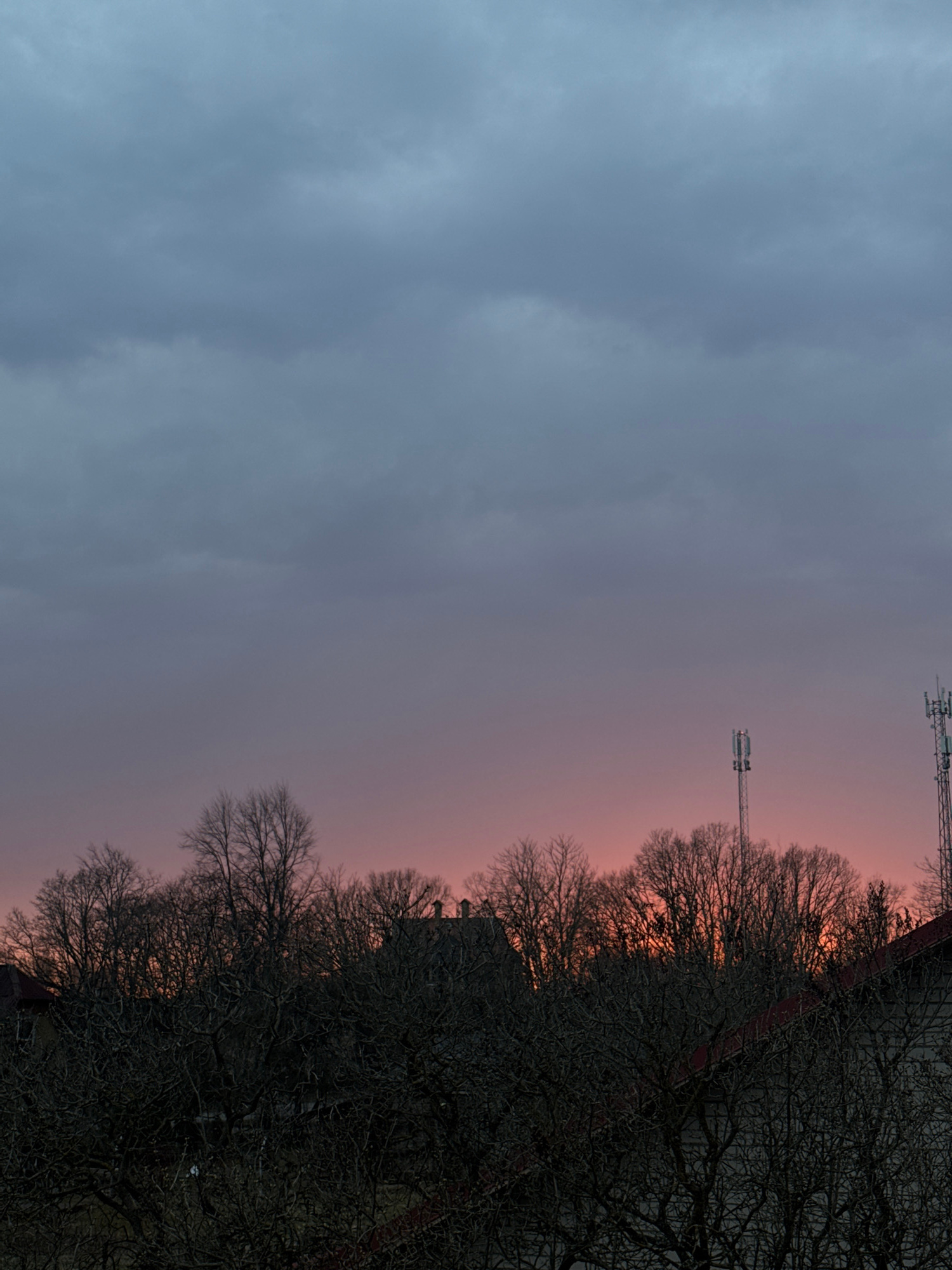 The image shows a twilight scene, likely in Carnikava, Latvia, although this is not confirmed by the image itself. The sky transitions from a dark grey on the left to a pinkish-orange hue towards the…read more