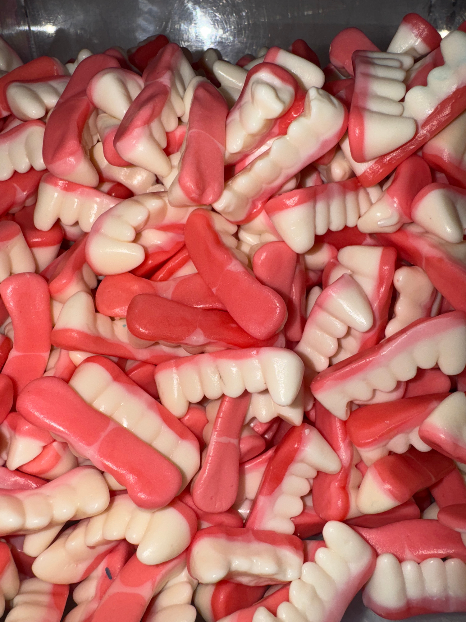 The image shows a dense pile of gummy candies shaped like sets of teeth and gums. The "teeth" are white, and the "gums" are pink. The candies fill the entire frame, creating a textured and colorful co…read more
