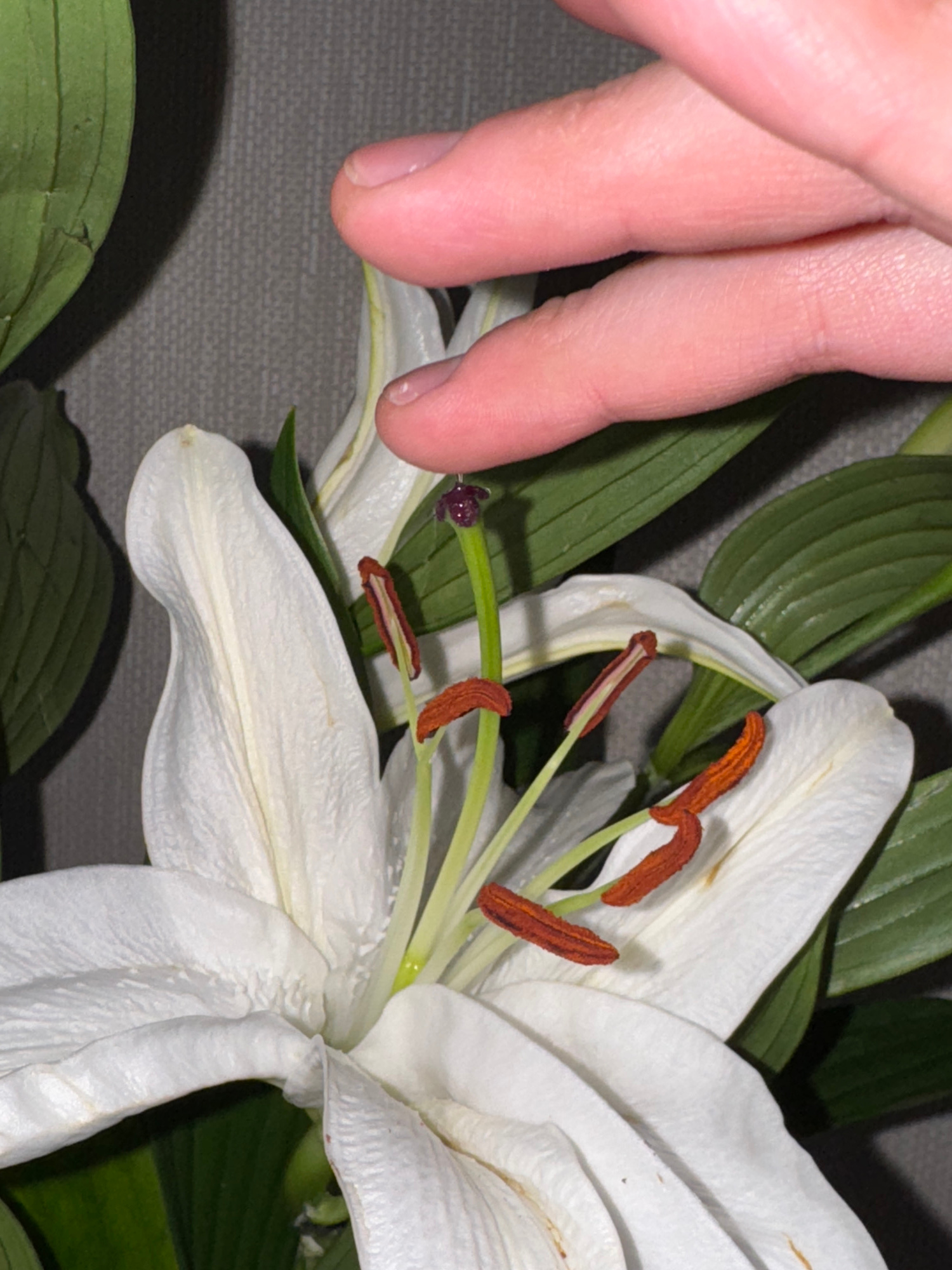 A close-up photograph shows a partially opened white lily flower with brown-tipped stamens and green leaves. A hand is partially visible, with fingertips touching the edge of a petal. The background i…read more