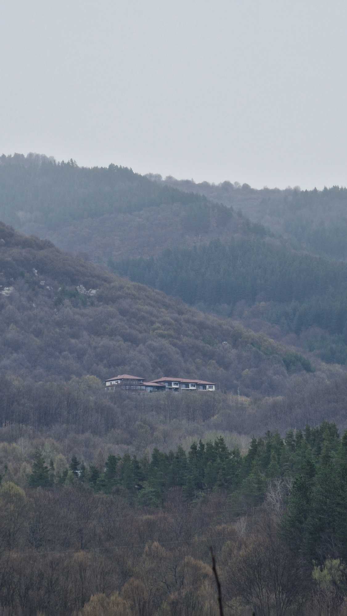 The image depicts a mountainous landscape with a building nestled on a slope. The sky is overcast, suggesting a cloudy or misty day. In the middle ground, a multi-story building is visible, appearing…read more