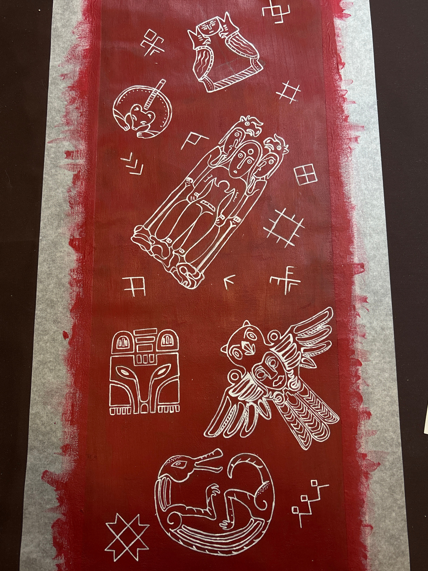 The image shows a reddish-brown canvas with white drawings inspired by Permian animal style art, a distinctive artistic style from the region of Perm, Russia. The drawings include stylized animal figu…read more