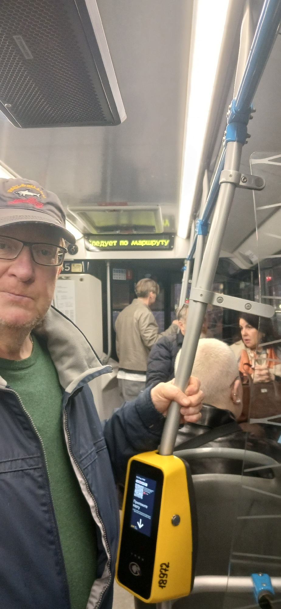 A man is holding onto a handrail with an electronic ticketing device attached, likely in a bus or trolleybus, in Moscow, Russia. The ticketing device is yellow and displays an arrow and text in Russia…read more