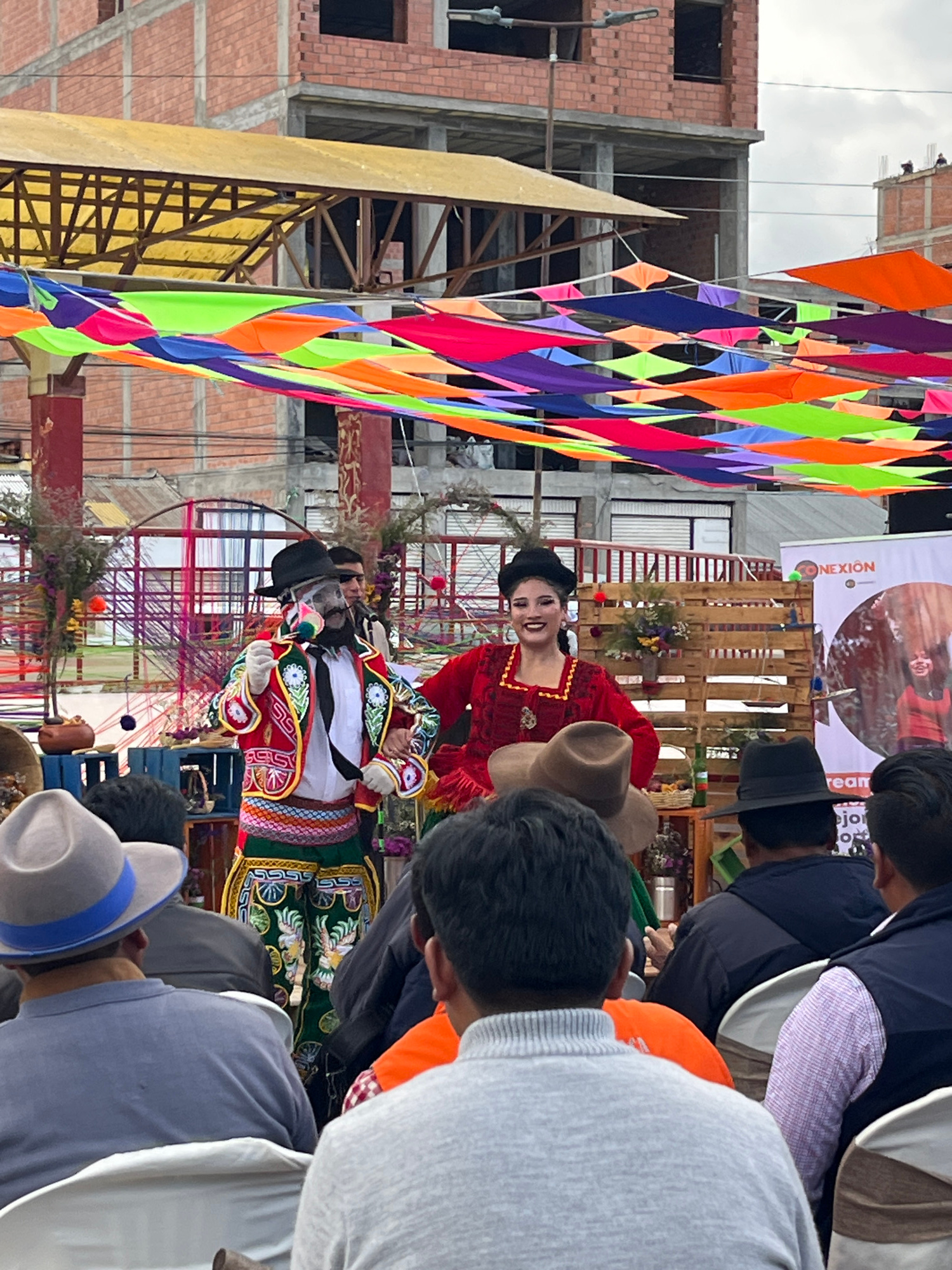 The image captures a cultural event in the city of El Alto, Bolivia. A woman in a red traditional dress and a man in a black hat and colorful traditional attire are performing or presenting. They stan…read more