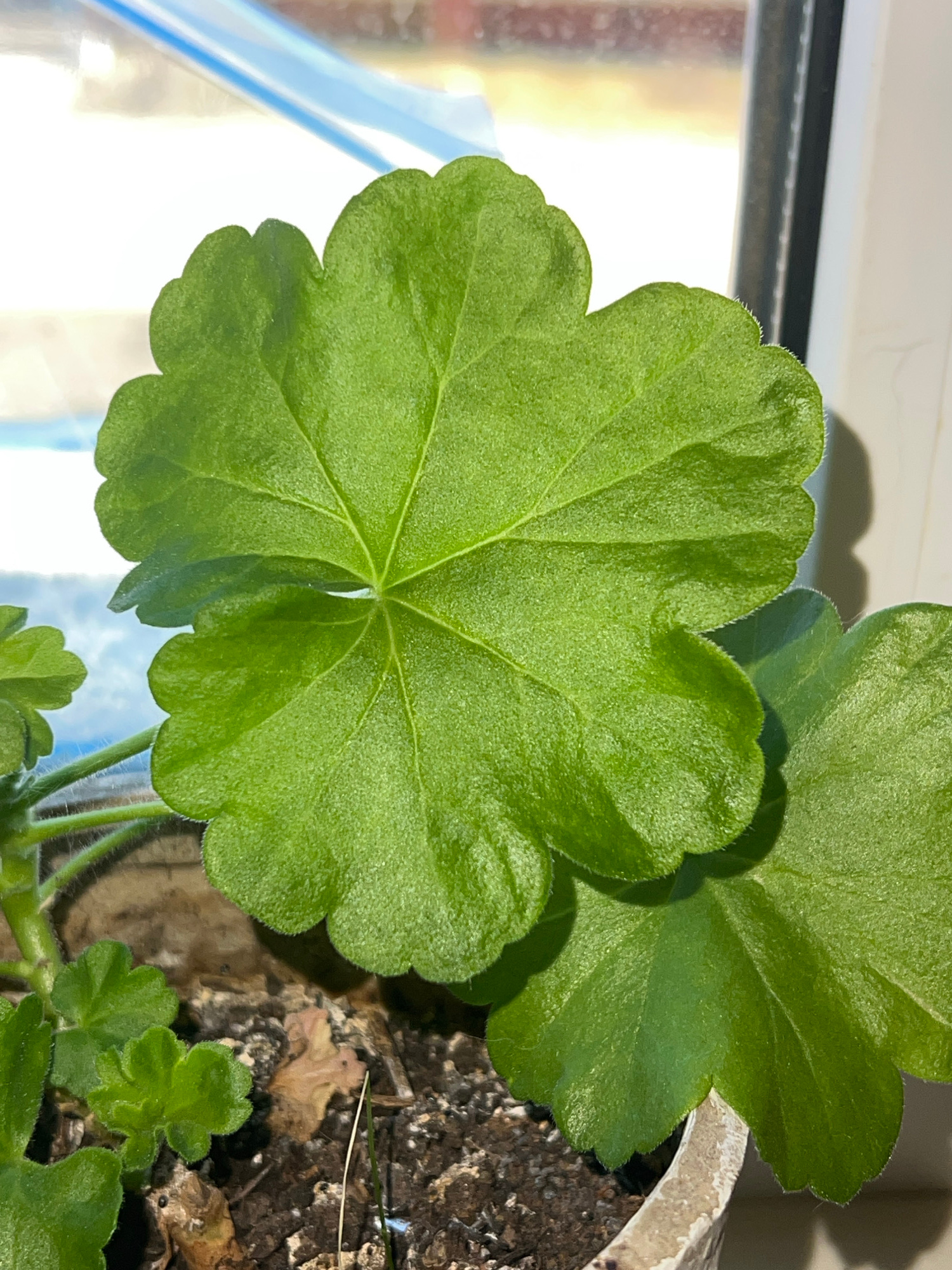 A close-up shot depicts a green geranium plant, likely indoors, in a pot filled with dark soil. The leaves are large, rounded, and textured with scalloped edges. A window with a blurred cityscape refl…read more