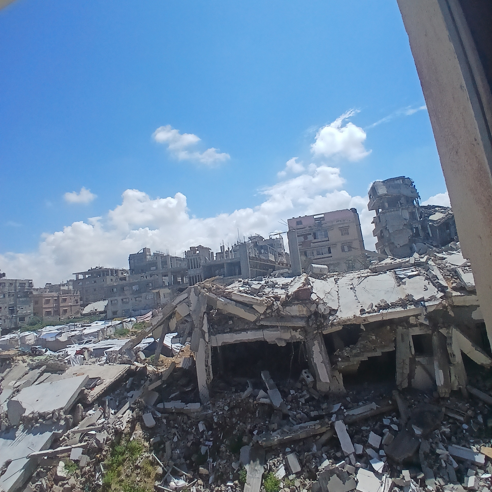 The image depicts a scene of extensive destruction in an urban area, likely in Gaza, Palestinian Territory, due to the nature of damage and building style. The foreground is dominated by the skeletal…read more