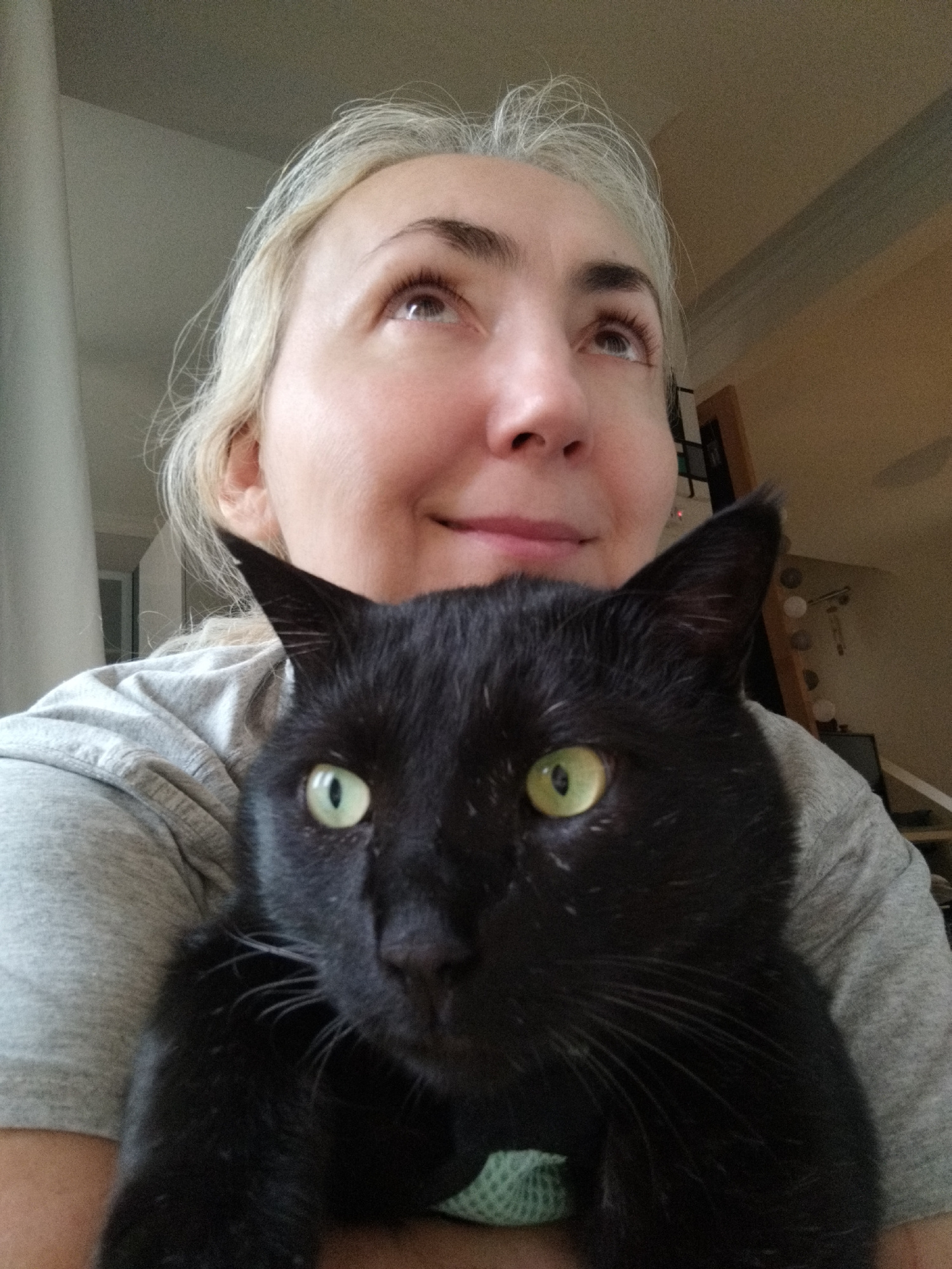 A woman with fair skin and grey hair is holding a black cat. The woman is looking upwards with a slight smile. The cat is looking directly at the camera with green eyes. The woman is wearing a grey sh…read more