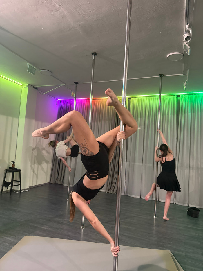 The scene depicts an indoor pole fitness studio in Batumi, Georgia. Three adult females are engaged in pole dancing exercises. In the foreground, a female with long brown hair, wearing a black athleti…read more