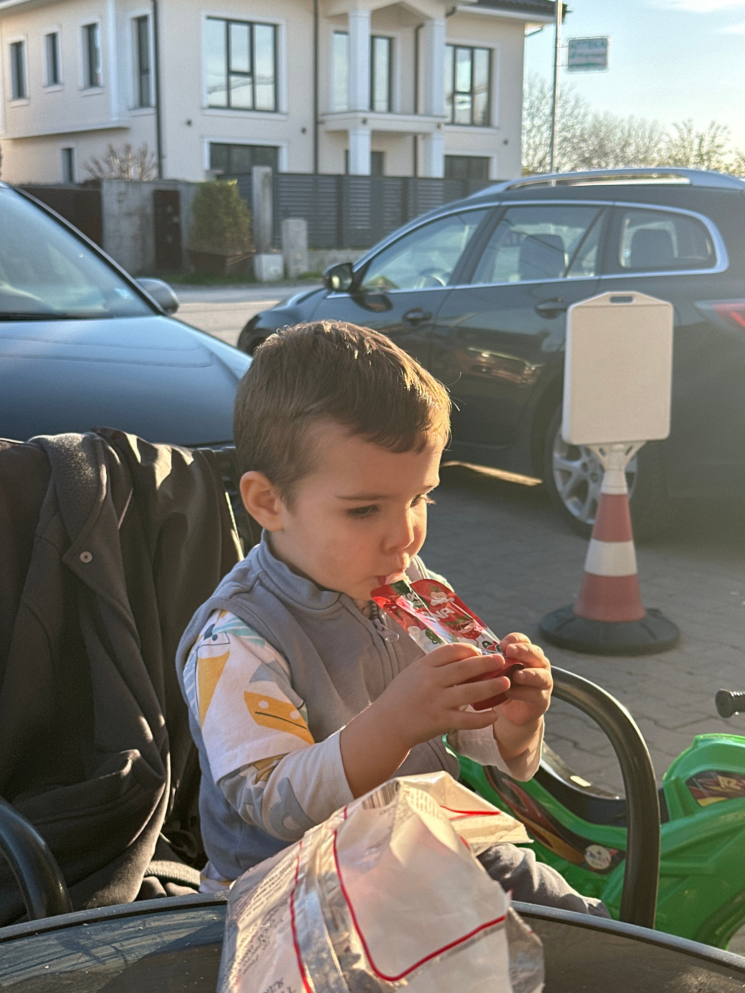 A young child is drinking from a pouch while seated in a location with outdoor seating, possibly a cafe or restaurant. A dark-colored car is parked behind the child, and a traffic cone with a white si…read more