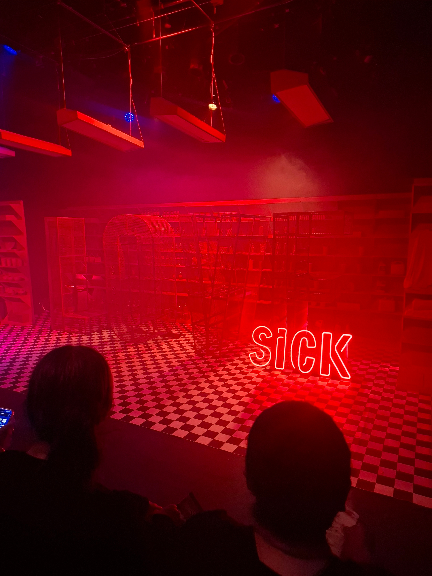 The image shows an interior, possibly a nightclub or bar, in Mexico City, Mexico. The lighting is predominantly red. A neon sign with the word "SICK" is visible on a wall with a black and red diamond…read more