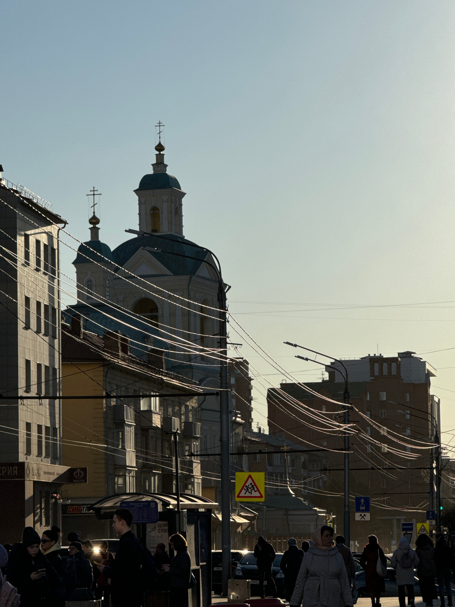 Captured in Krasnoyarsk, Russia, the image shows an urban street scene. A church with a distinctive blue dome and cross-topped spire stands amidst buildings. Utility lines traverse the sky, adding to…read more