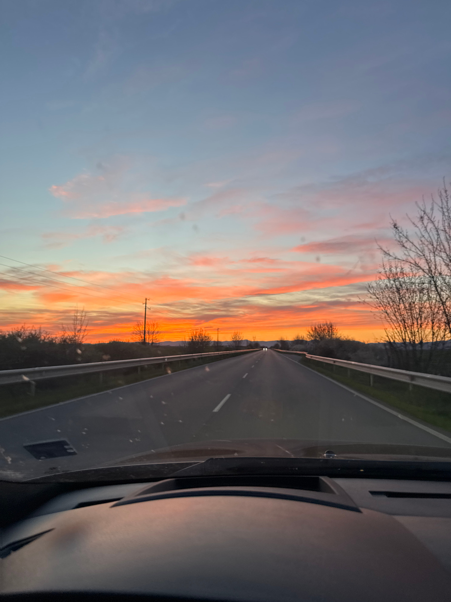 The image depicts a sunset view from a car traveling on a road. The sky exhibits a gradient of colors, with blue blending into orange and red hues near the horizon. Streaks of clouds run parallel to t…read more