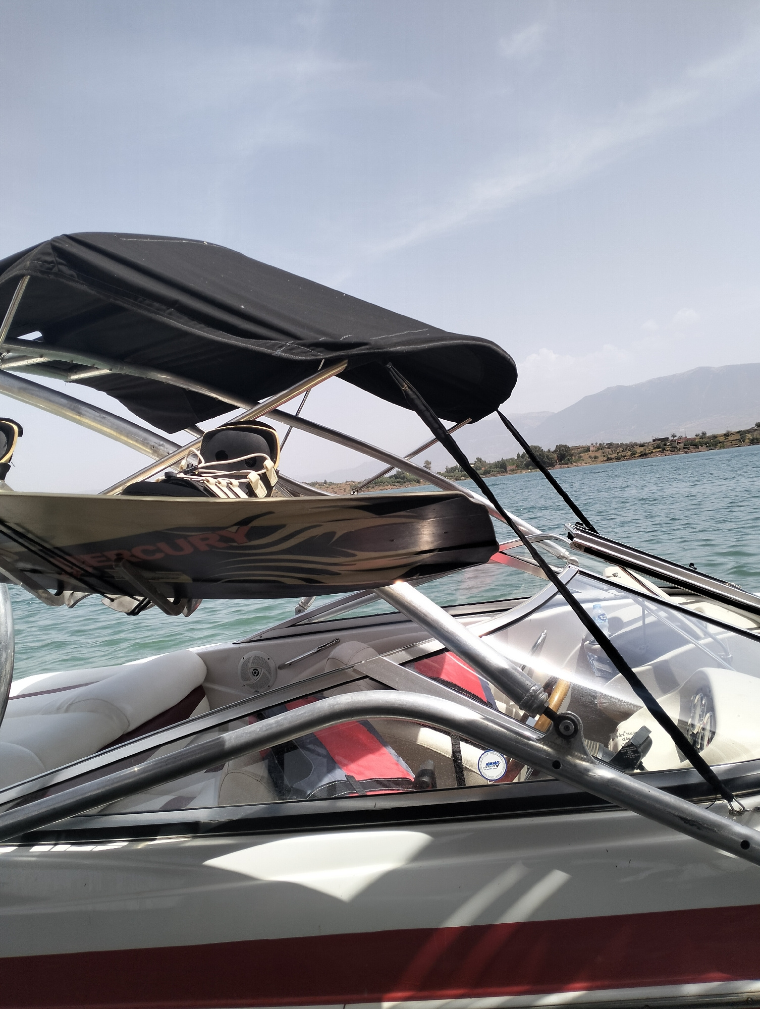 The image depicts a motorboat on the lake in Bin El Ouidane, Morocco. A black canvas bimini top shades a wakeboard with black bindings, suspended in a rack. The boat has a white hull with a red stripe…read more