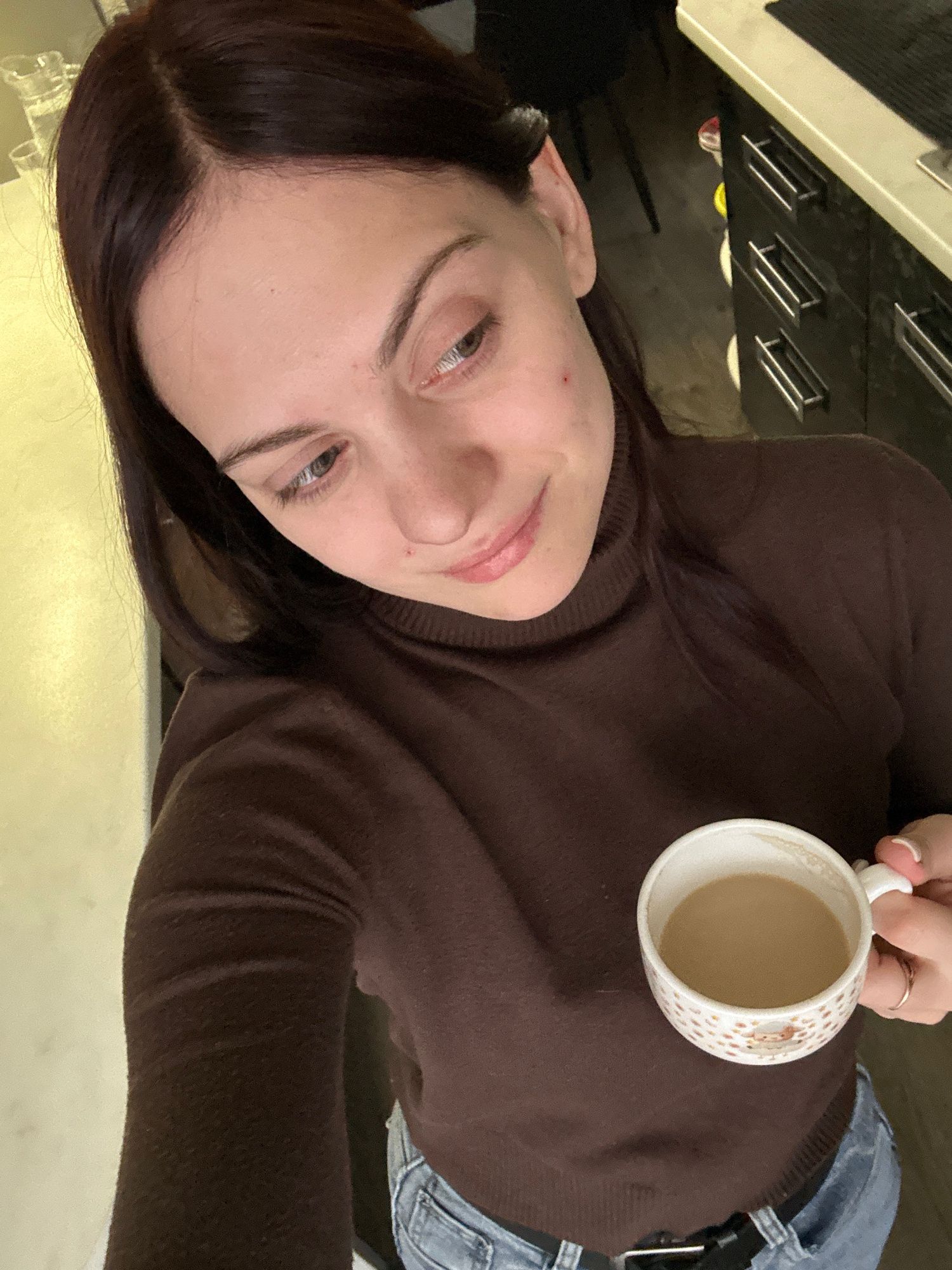 A person is holding a mug in an indoor setting. The person, wearing a brown turtleneck sweater and blue jeans, is holding a white mug containing a light brown liquid. The background includes a white c…read more