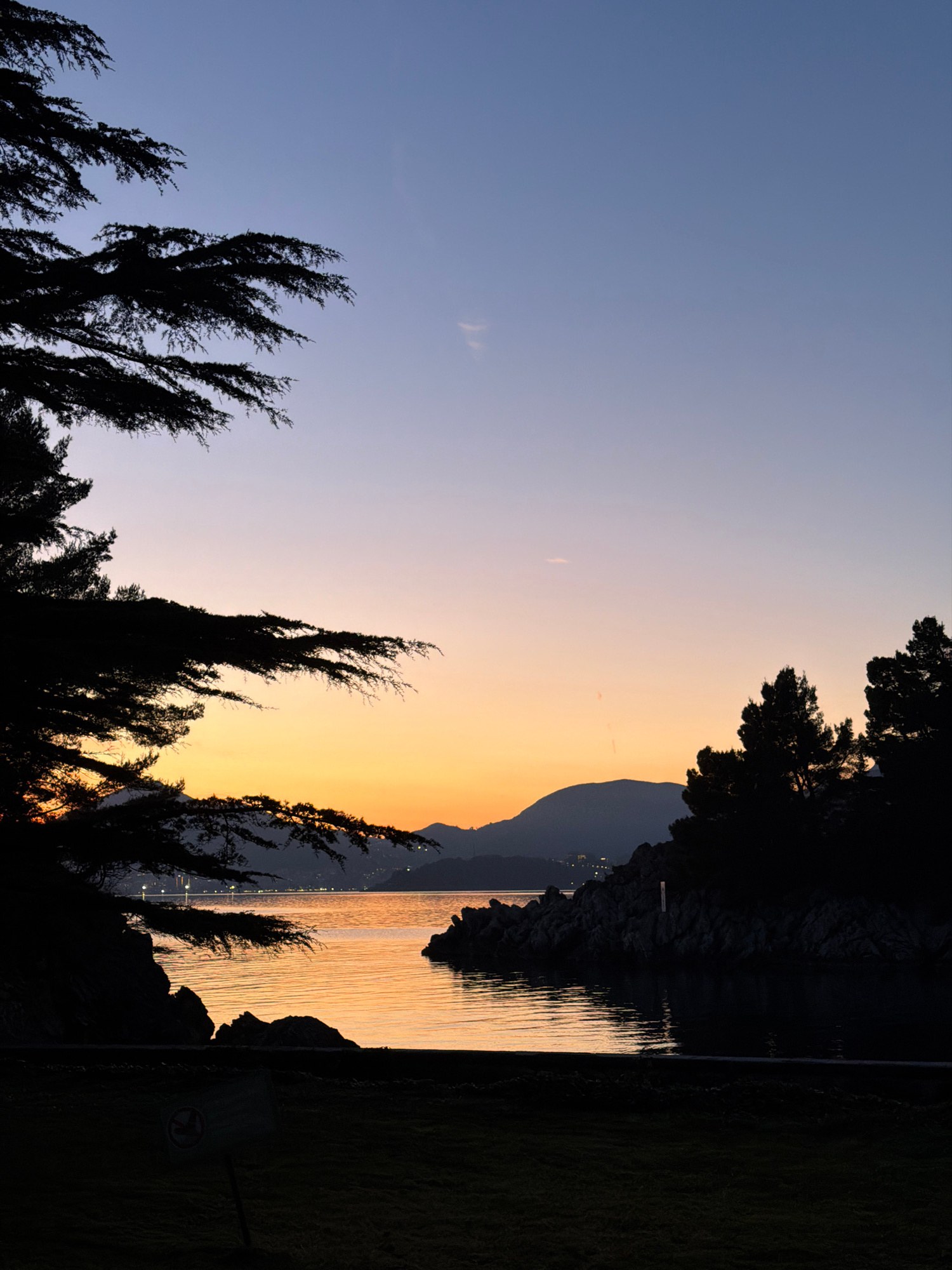 The image shows a sunset over the Adriatic Sea in Pržno, Montenegro. Silhouetted trees frame the view on both sides. The sky transitions from blue to orange, reflecting on the water. Mountains are vis…read more