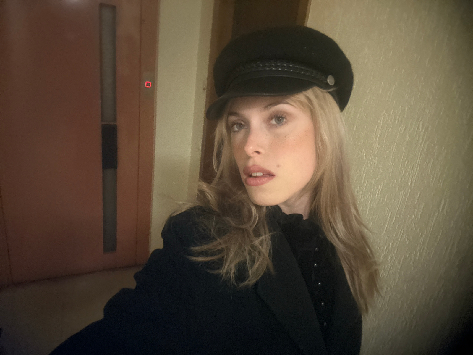 A fair-skinned woman with blonde hair is photographed indoors. She wears a black cap and a dark-colored top. The background includes a light-colored wall and a door with a dark vertical panel. The pho…read more