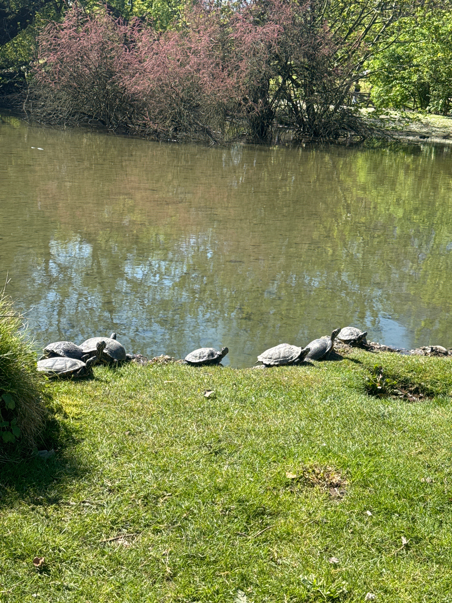 The image depicts a pond in Milan, Italy, lined with grass. A row of turtles basks on the grassy bank. Trees border the opposite side of the pond. The water's surface reflects the sky and surrounding…read more