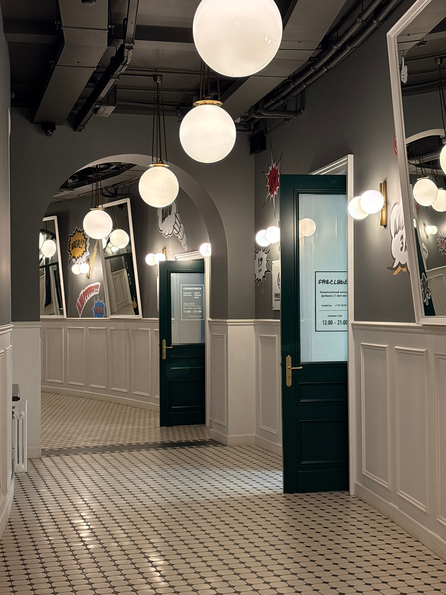 The image is a slightly distorted upward shot in an interior space. The walls have small oval tiling, a white trim along the ceiling, and green doors with glass windows and gold handles, each with bla…read more