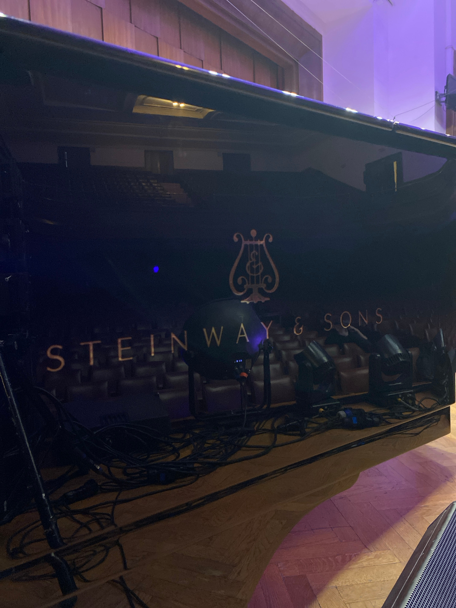 The image shows a partial view of a Steinway & Sons grand piano, likely on a stage setup. A rigging with stage lights is mounted behind the piano, with many black cables visible. The setting appears t…read more