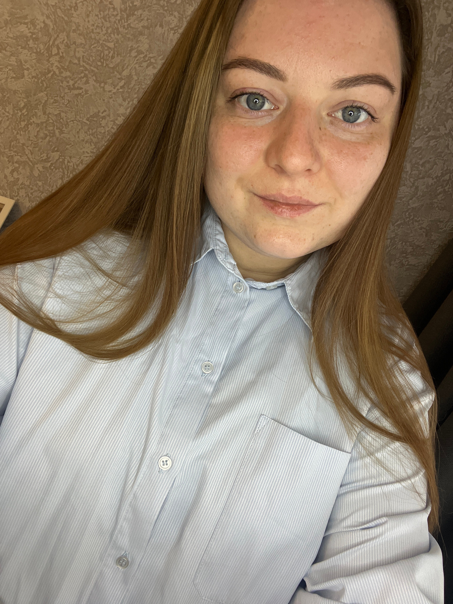 A woman with long, light brown hair is lying on her side, wearing a light blue and white striped button-down shirt. She has fair skin, freckles, and light-colored eyes. The background includes a textu…read more