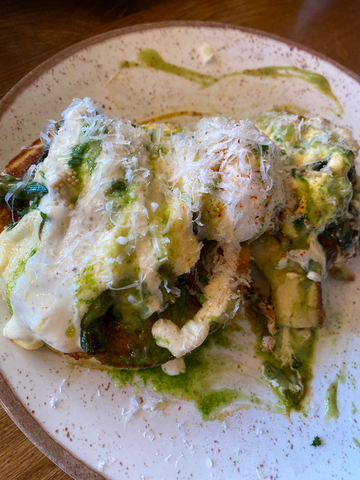 The image is a close-up shot of a plate of food. Two stacks of toasted bread appear to be covered in white sauce and shaved cheese. Green sauce is drizzled on top. The plate is cream-colored with brow…read more