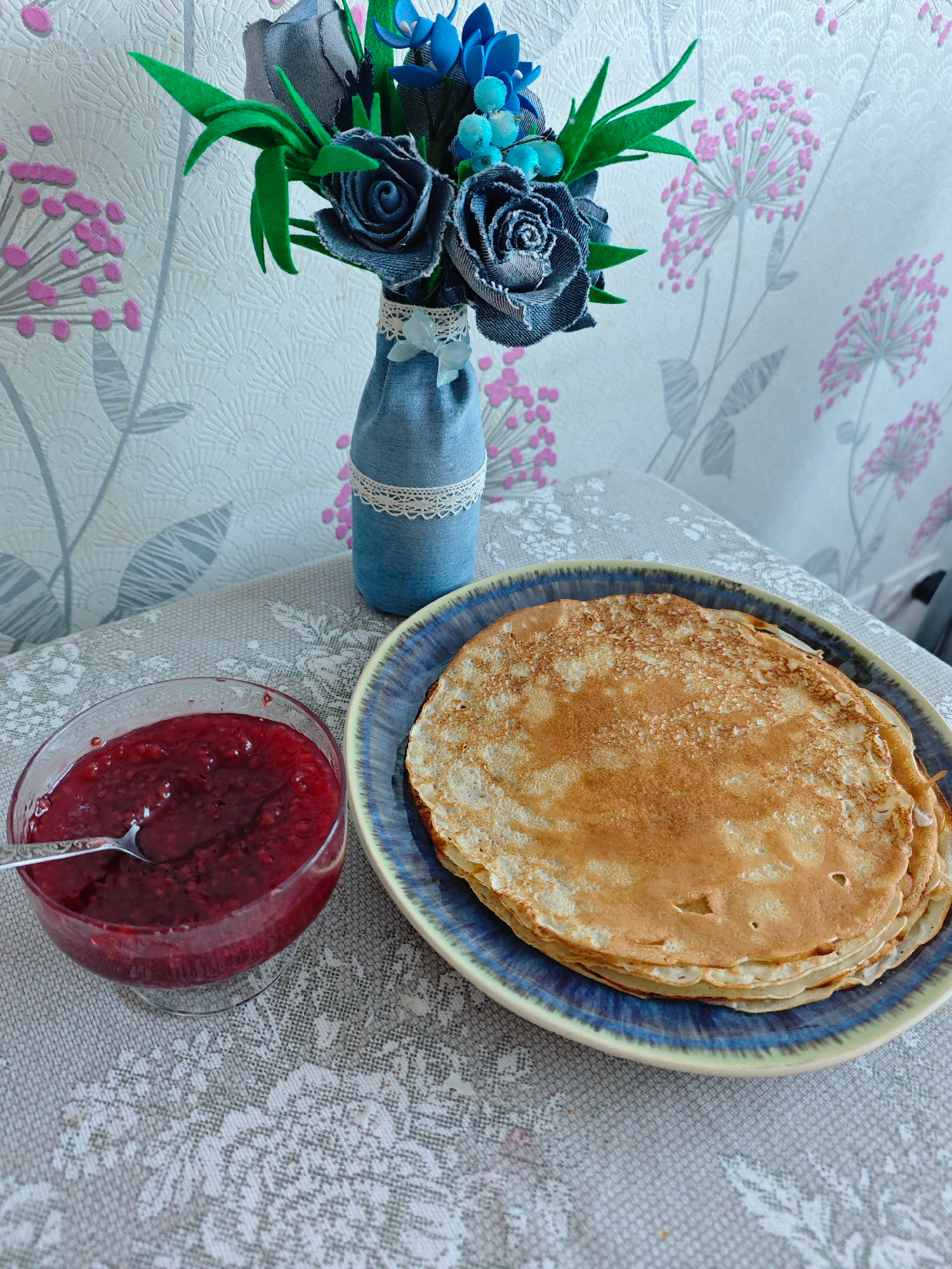 The image depicts a still life arrangement of food and decorative items, likely indoors. The scene includes a plate of stacked pancakes, a glass bowl filled with red fruit preserve (possibly raspberry…read more