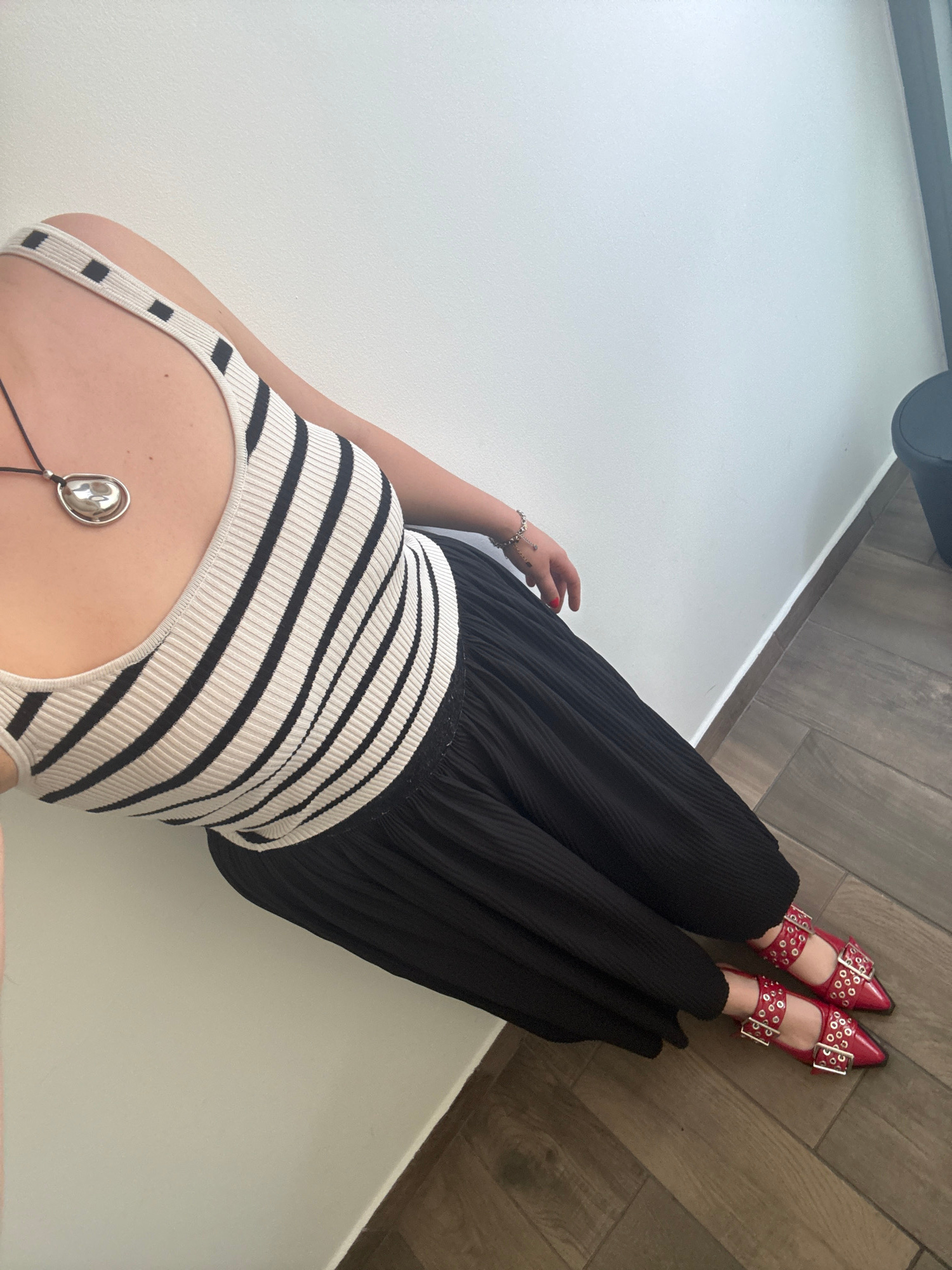 An overhead shot captures a person reclining indoors, dressed in a ribbed, sleeveless top with horizontal black and off-white stripes, paired with black pleated wide-leg pants. On her feet are distincβ¦read more