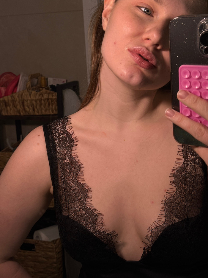 A fair-skinned female is depicted in a close-up, dimly lit mirror selfie, viewed from her upper chest to the top of her head. She holds a dark-colored smartphone, featuring a bright pink PopSocket wit…read more