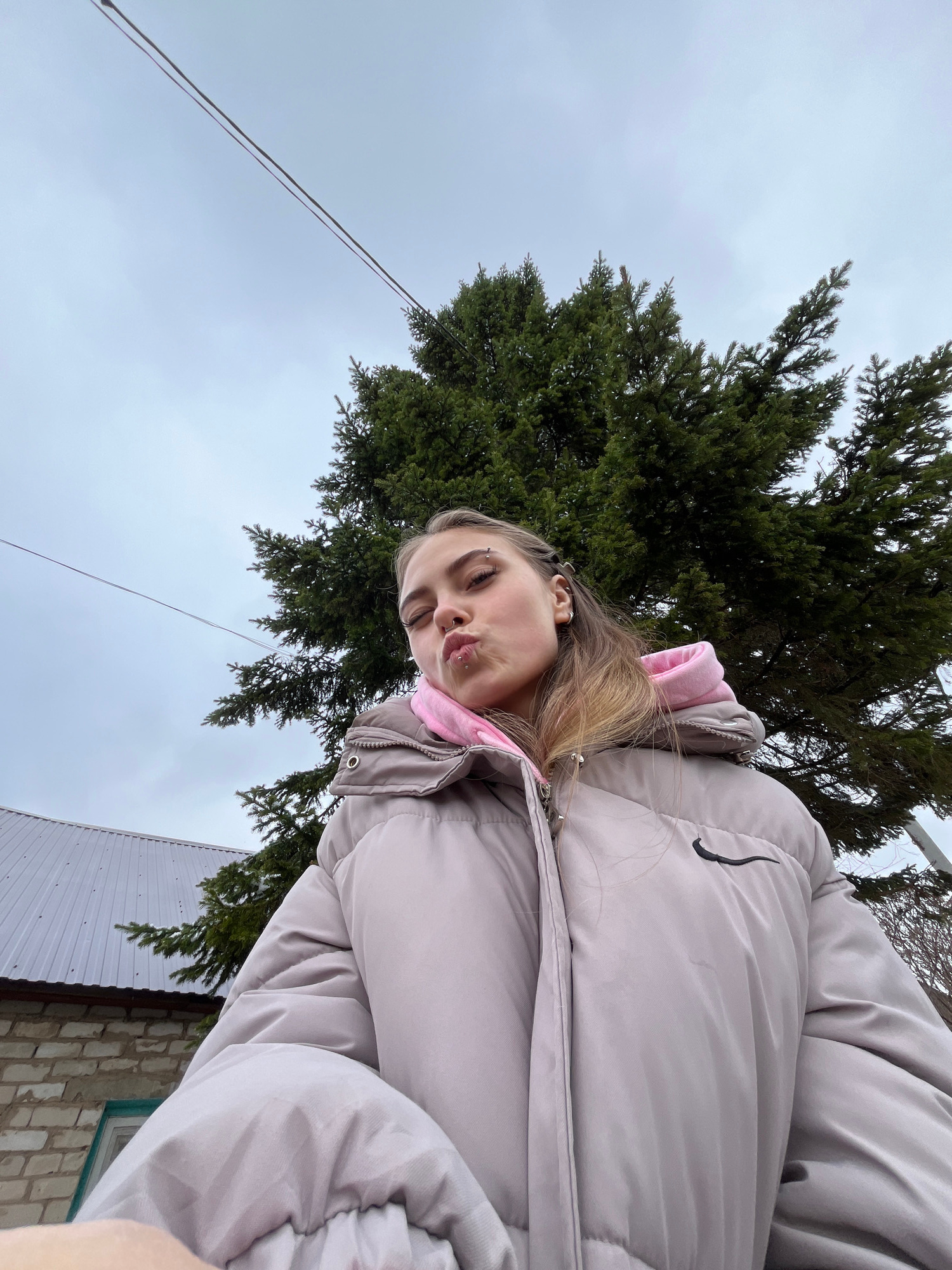 A young woman in a light-colored puffer jacket stands outdoors with a coniferous tree behind her. The location appears to be in Фоки, Russia, as indicated by the request. The sky is overcast. A buildi…read more