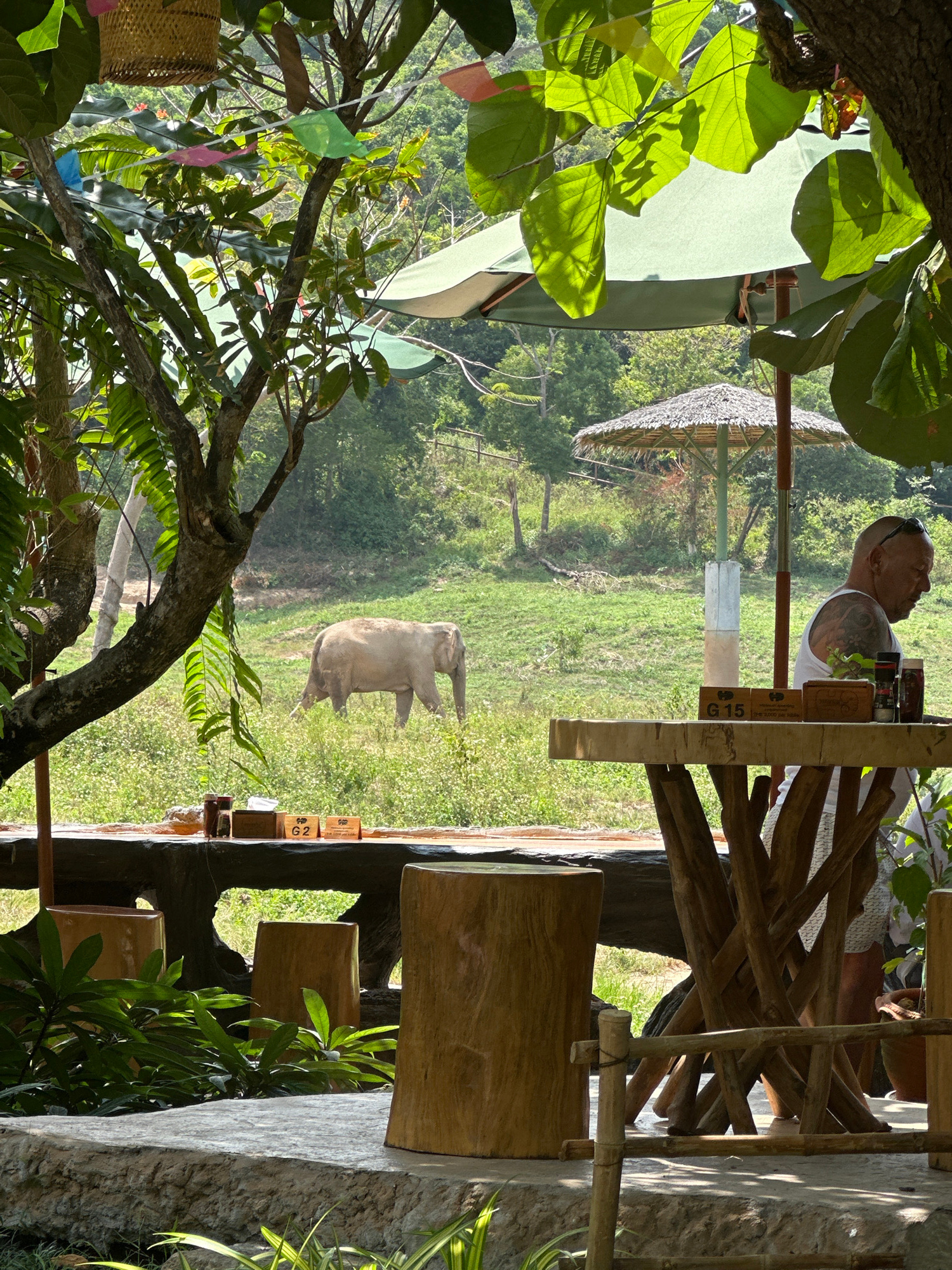 The scene is a landscape captured from an elevated, partially covered vantage point in what appears to be a natural setting in Ko Samui, Thailand. In the foreground are foliage, branches, and an umbre…read more