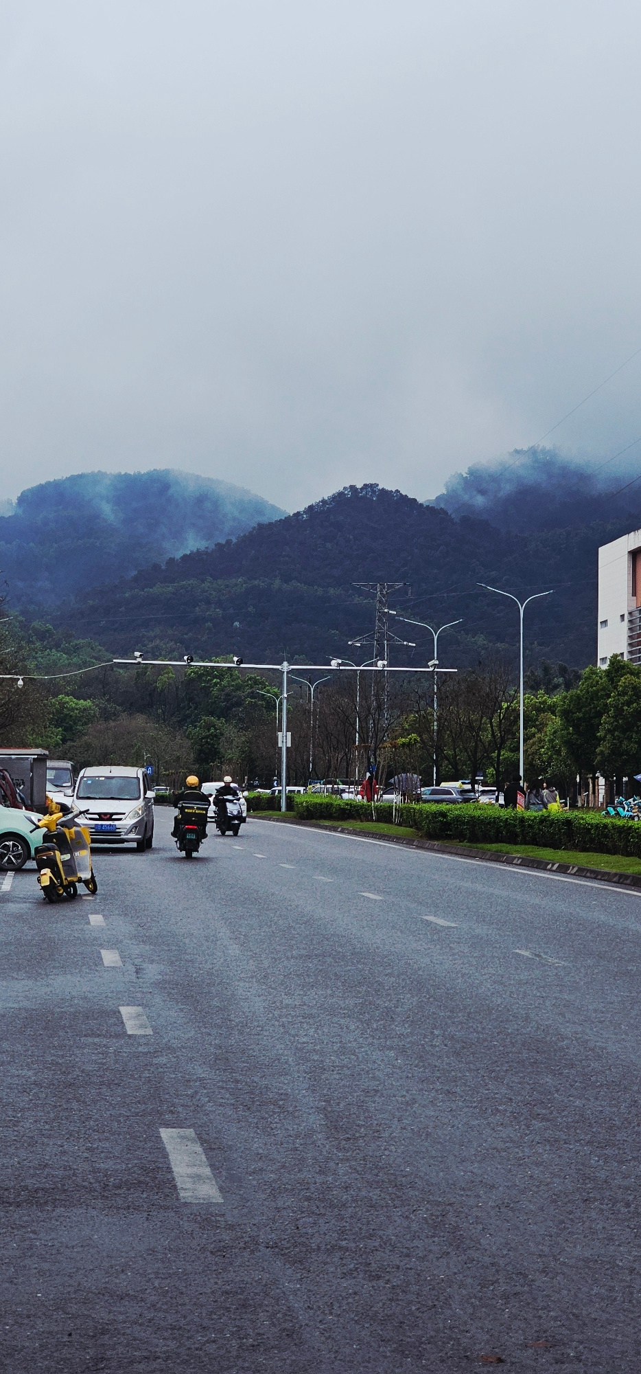 The image depicts an urban road scene in Shapingba District, China, under overcast conditions. A multi-lane asphalt road occupies the foreground, marked with white dashed lane lines and appearing damp. In the left lane, a yellow electric scooter is positioned, followed by a light blue sedan, and then a silver minivan with a visible license plate reading "渝A 49AE6." Two individuals on motorcycles are traveling away from the camera in the adjacent lane; the lead rider wears a yellow helmet and a dark jacket, while the second wears a white helmet. Road infrastructure includes multiple streetlights with curved arms, overhead gantries equipped with numerous surveillance cameras and traffic sensors, and a prominent metal electricity pylon in the mid-ground on the left. A green shrubbery median strip separates the road, flanked by deciduous and evergreen trees lining the thoroughfare. On the right side of the road, a multi-story building with white and orange-brown facades is visible, along with indistinct figures and parked vehicles further down. In the background, forested mountains are partially obscured by mist or low-hanging clouds. | Open Wire