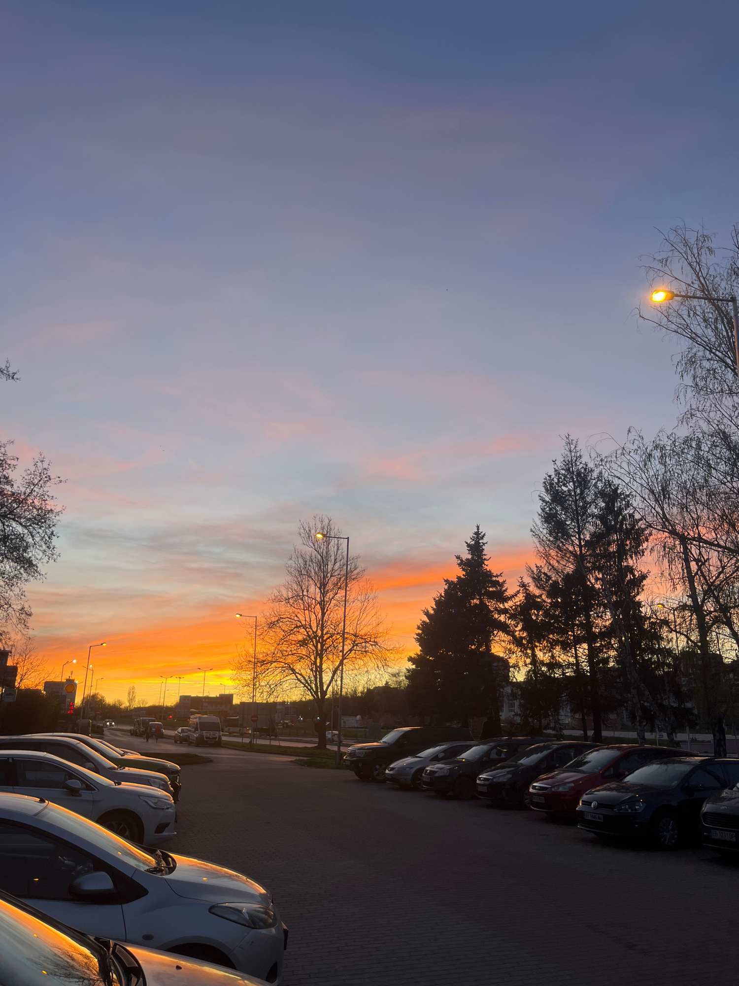 The image shows a sunset over Veliko Tarnovo, Bulgaria. The sky is a gradient of colors, from blue at the top to orange near the horizon. Silhouetted trees line the right side of the frame, along with…read more