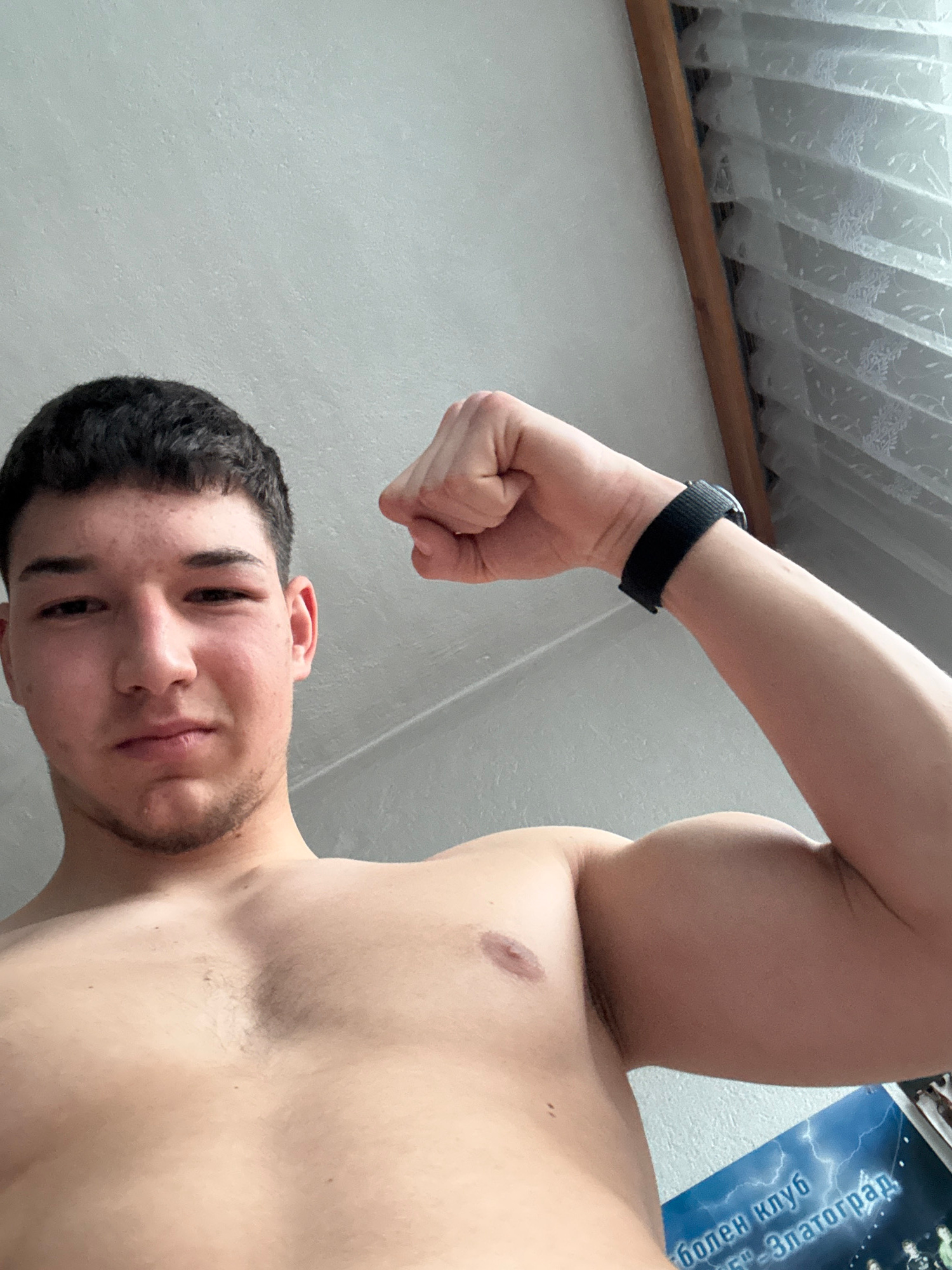 A young man is captured in a close-up, low-angle shot, appearing shirtless and flexing his right bicep. He has short, dark hair and light stubble on his jawline and chin. He looks towards the camera w…read more