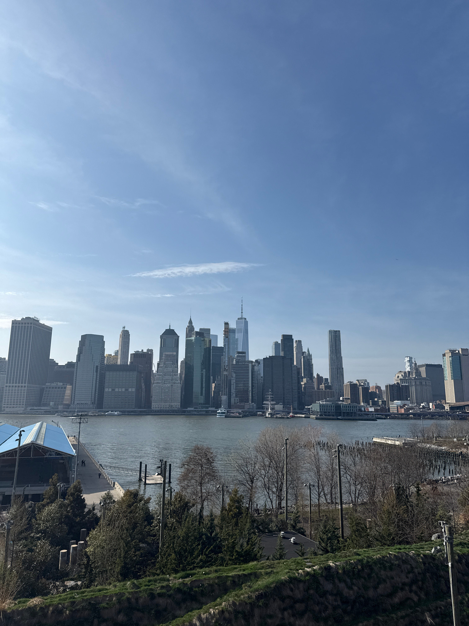 The image shows the skyline of Lower Manhattan in New York City, USA, from across the East River, likely from Brooklyn. Key buildings, including One World Trade Center, are visible. The East River sep…read more