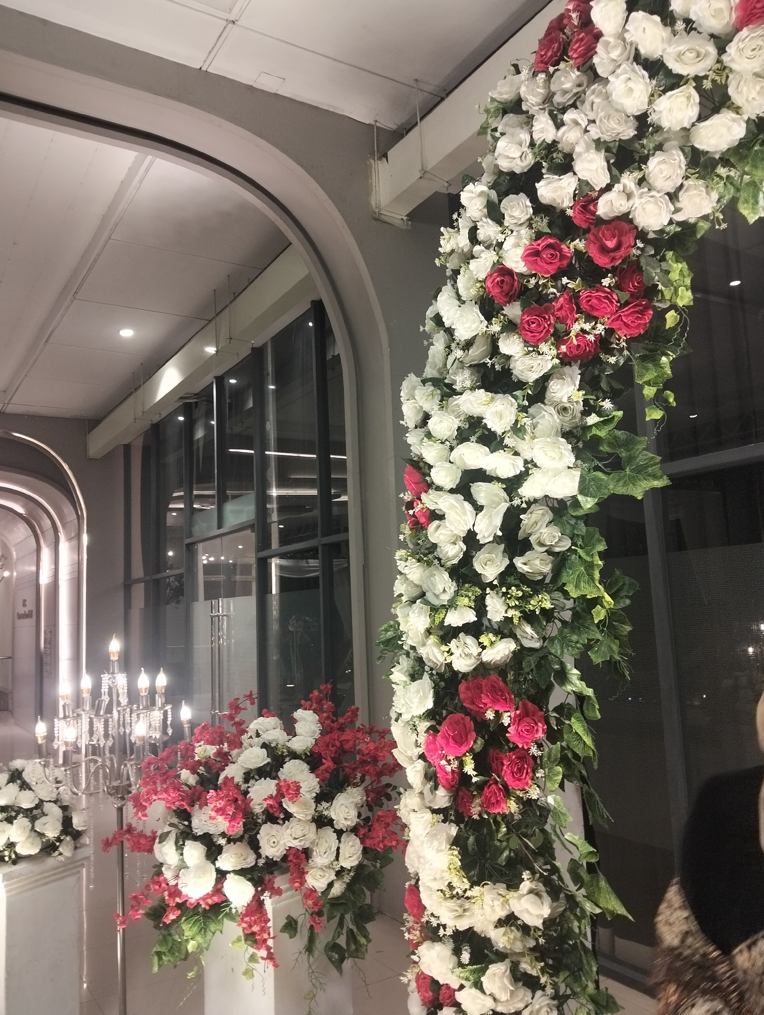 The image shows an indoor event space, likely a wedding or formal gathering, in Dhaka, Bangladesh. The space is decorated with large floral arrangements of white and red roses, interspersed with green…read more