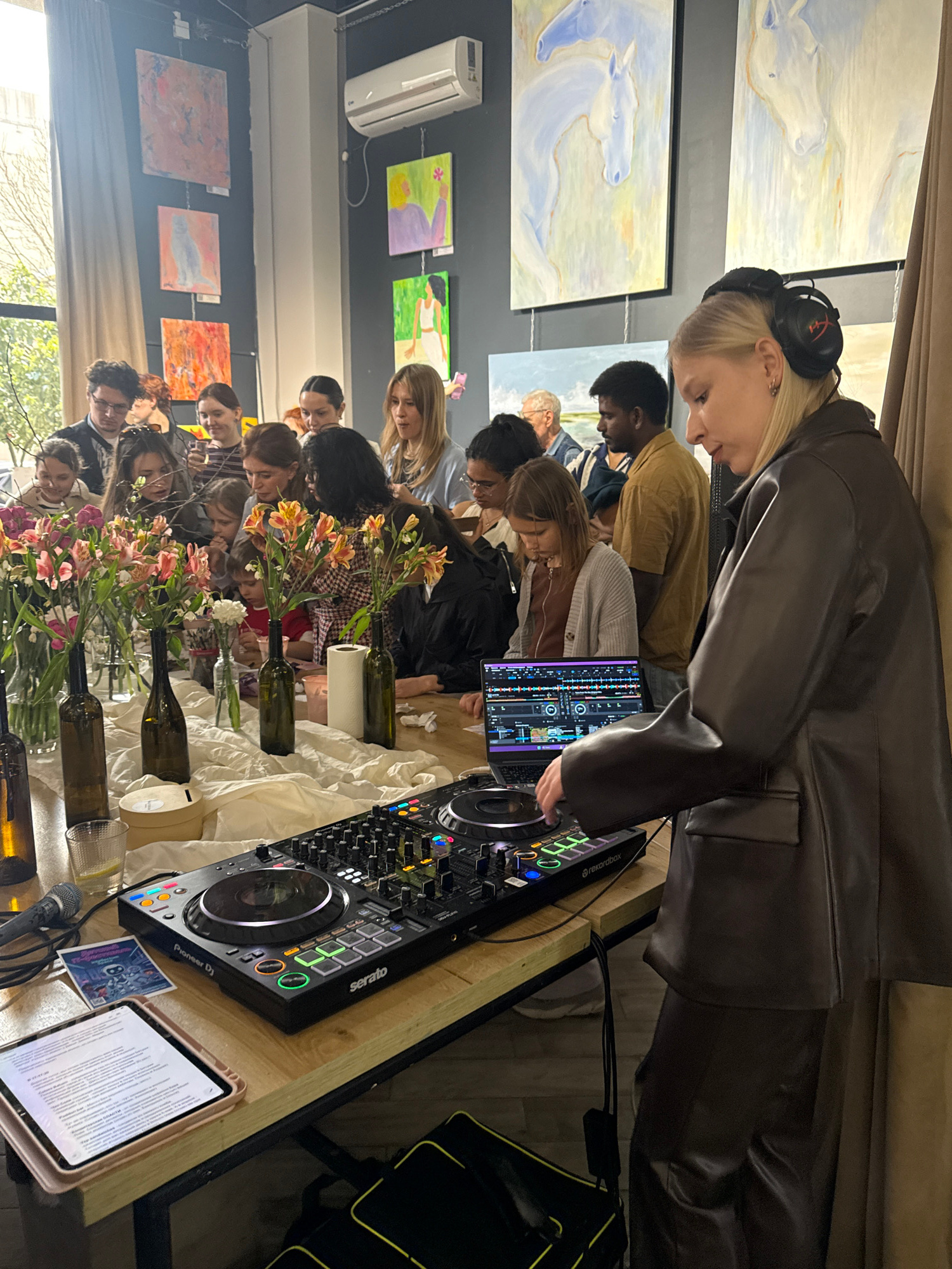 A medium shot captures a crowded art gallery or studio, likely in Batumi, Georgia, featuring a DJ mixing music at a table. The DJ, wearing headphones and a leather jacket, is the focal point, interactβ¦read more