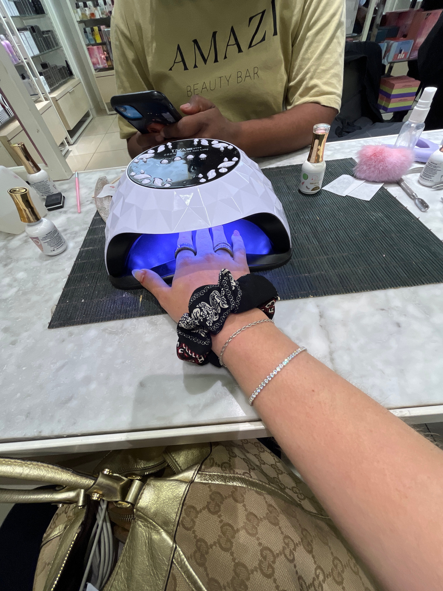 A person is having their nails done, placing their hand in a UV nail lamp for gel curing. A manicurist, wearing a tan t-shirt with "AMAZI BEAUTY BAR" printed on it, is operating the lamp and possibly…read more