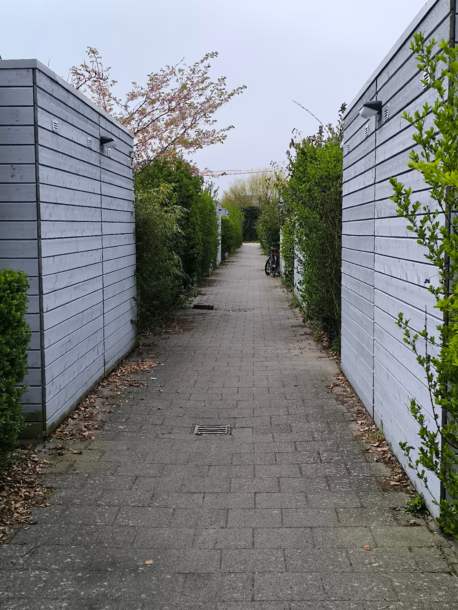 A long, narrow walkway constructed of gray brick pavers runs between two parallel rows of structures, appearing to be garages or storage units made of horizontal, light gray wooden planks. Green bushe…read more